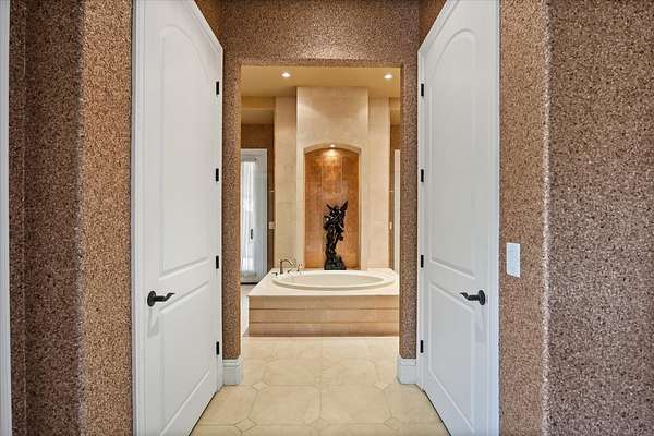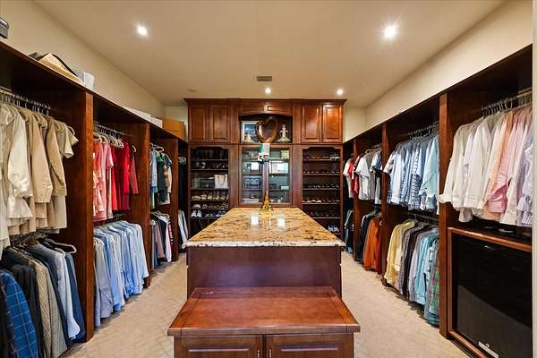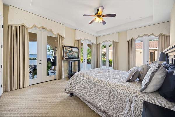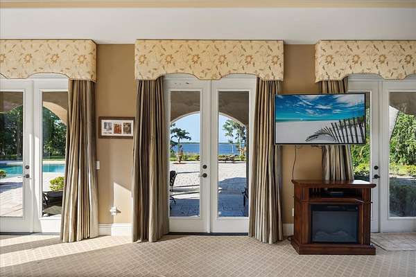 The primary retreat serves as a sanctuary, boasting 8 sets of French doors that open to the pool and lake, along with a primary closet designed as a "safe room." The adjacent primary bathroom features a serene garden/spa area for relaxation. Culinary enthusiasts will appreciate the state-of-the-art chef's kitchen, complete with top-of-the-line appliances and a generous walk-in butler's pantry.