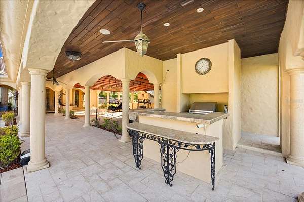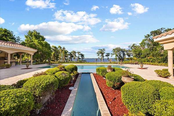 Additional highlights of the property include a temperature-controlled wine cellar, a private movie theater, and dedicated nanny's living quarters. The 6-car garage offers ample attic storage for convenience. The outdoor oasis features a sports pool with multiple water features, a summer kitchen, a wet bar, and an additional fireplace under a spacious veranda, all overlooking the serene waters of Lake Jessup.