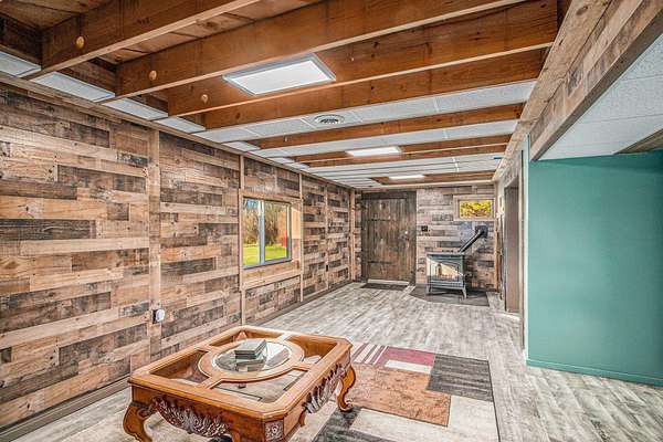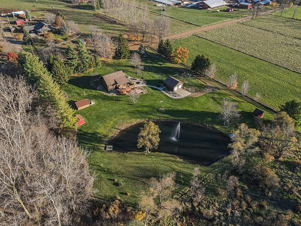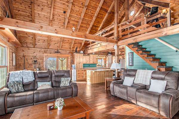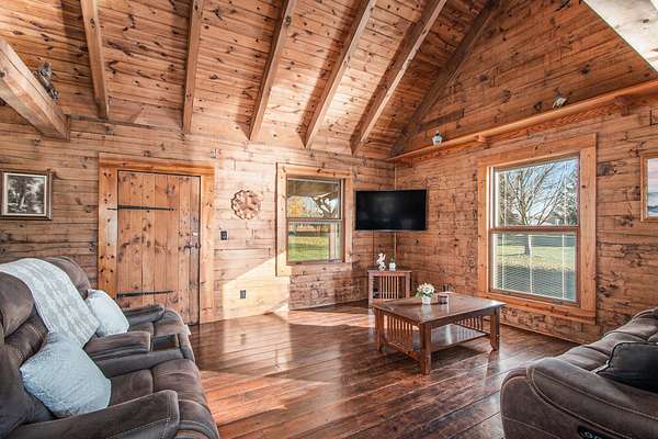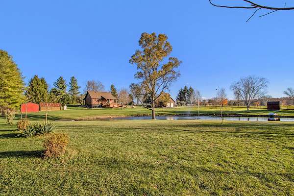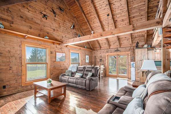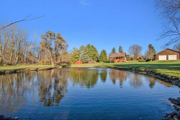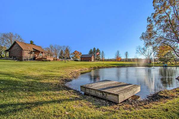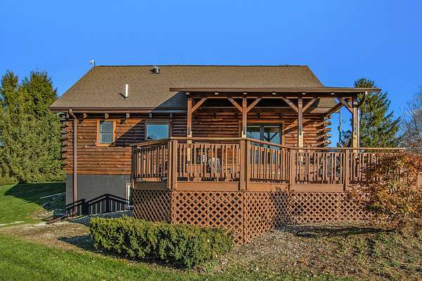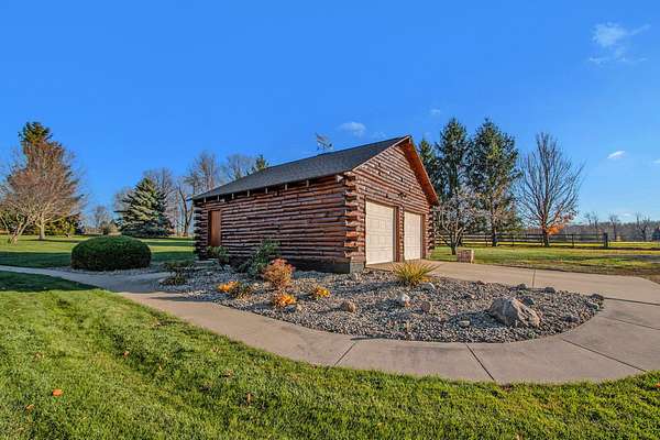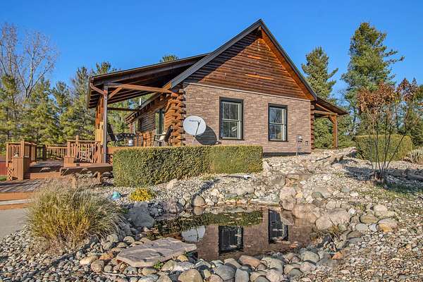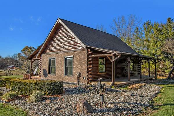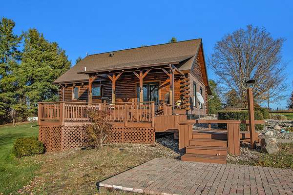 Spectacular Log Home on 2.45 Acres with Private Stocked Pond! This beautiful log home offers the perfect blend of rustic charm and modern comfort. Set on 2.45 serene acres, the property includes a private stocked pond with bluegill, bass, and turtles-an ideal retreat for nature lovers. Offering 2-3 bedrooms and 2 full baths, this home is move-in ready. The home features a walkout lower level, loft, and numerous recent improvements including a NEW furnace/AC, NEW pellet stove, complete basement remodel, NEW stacked-stone siding, and more. Inside, you'll love the warm, inviting atmosphere with a great room that flows seamlessly into the living room, highlighted by high ceilings and exposed wood beams. The kitchen showcases hickory cabinetry, solid-surface countertops, and all appliances included. The main-floor primary bedroom provides convenience, while the loft-with abundant closet space-serves as a spacious second bedroom. The walkout level adds fantastic additional living space with with a cozy family room featuring a pellet stove, an office, a potential third bedroom with electric gas-log fireplace, full bath, and laundry area. Exterior features include a 2-car detached garage, beautiful landscaping with 3 apple trees and 4 grapevines, a storage shed, generous chicken coop, and lean-to for firewood. Seller is also including the pond fountain, paddle boat, dock, and a brand-new washer and dryer. This log home is truly a must-see!