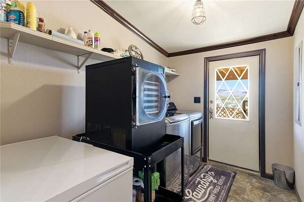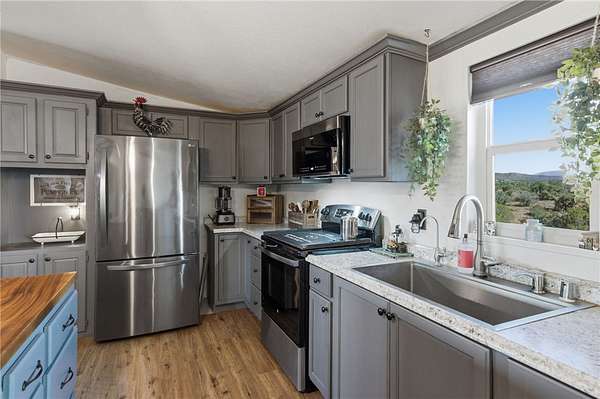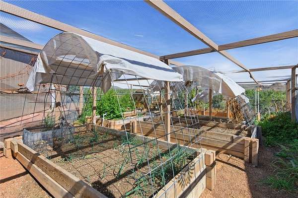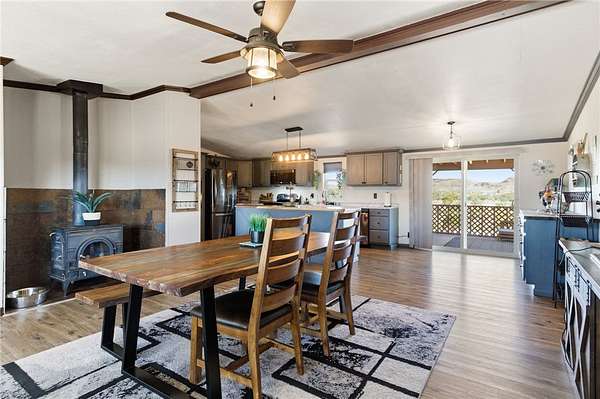 Newly remodeled, turnkey homestead set on just under 40 acres of breathtaking high desert landscape. Thoughtfully designed for sustainable living without sacrificing convenience, a fully fenced acreage, plus a fenced backyard surrounding the home, creating a secure and private setting complete with a private well, soft water system, and reverse osmosis. The home has been extensively upgraded and leveled with all 40 supports adjusted, 18 overextended supports added, and brand-new insulation installed underneath for long-term stability and efficiency. All new windows and sliding glass doors enhance natural light and energy performance. Inside, you'll fall in love with the modern farmhouse aesthetic, featuring a split-bedroom floor plan, fresh flooring, new paint, and renovations from top to bottom. The open-concept kitchen is stylish and functional, boasting butcher block countertops, abundant cabinetry, wood burning stove in the dining room and a large walk-in pantry for exceptional storage. Step outside and experience true homestead living. The fully enclosed top to bottom 35' x 35' raised bed garden offers a secure growing space, complemented by a 17' x 9' greenhouse equipped with electrical outlets, water spigot, drip system, and water cooler. Multiple large animal enclosures provide flexibility for chickens or other livestock. The property is further enhanced with fruit trees and an established berry garden, including Asian pear, apple, and peach trees, along with pomegranate, two seedless grape vines (one red and one green), four Big Daddy blackberry vines, one Crimson Giant red raspberry vine, and an additional blackberry vine. A 25-foot steel carport and 50-amp RV hookup add versatility for guests, travel, or equipment. An oversized double car garage offers additional covered parking, workshop space or more storage. Security and self-sufficiency are top priorities with a hardwired security system including cameras and TVs. Enjoy peaceful mornings on the covered front patio and unwind in the evenings on the expansive covered back deck, where 360-degree high desert views create a truly spectacular backdrop. Easy access with well maintained road, very short distance off pavement. Additional negotiable items may convey depending on offer, including a whole-house generator and Kubota tractor. Other furnishings in the home may be negotiable as well.