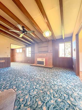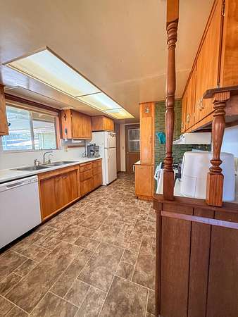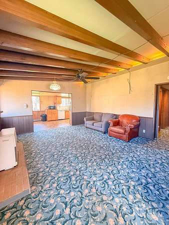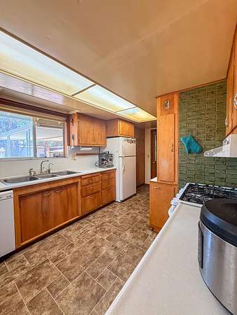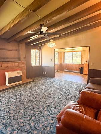 Original home of 2 bd 1ba with additional sq footage in county records. Garage was converted into an extra bedroom - upstairs - and huge den area. This area has a half bath, sauna, and baseboard heaters. Main house has Monitor heater and electric wall heaters. There is a single car, car port in front of the home and three double car ports behind. There are also a shed and a 40' container fitted out as shops with power. There is a small greenhouse and mulch pile, a fenced garden area, a garden shed, pole barn, and a large covered areas used for wood storage. There are sprinklers for the front lawns and water to the garden area. Kitchen includes most appliances, plus cupboards and storage galore. Range and water heater are propane. Home also has a covered concrete patio at rear with a lovely view of Mt Shasta.