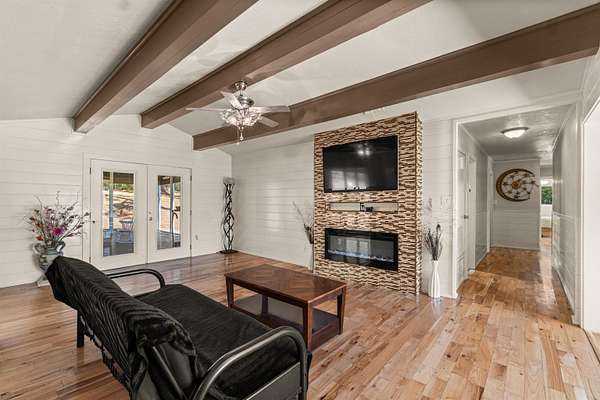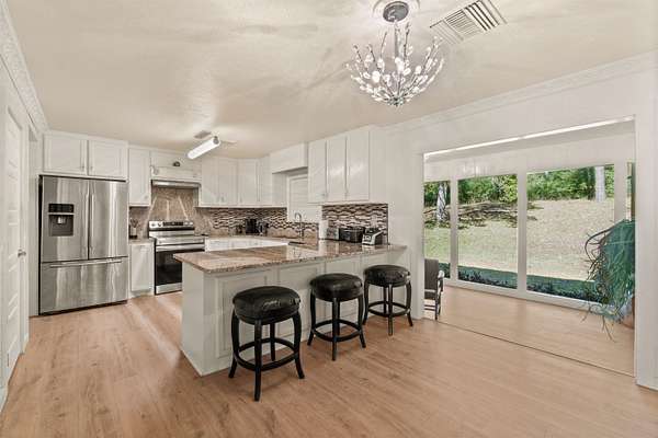 This beautifully remodeled home features three bedrooms and two full bathrooms, spanning just under 2600 sq ft with an open floor plan. Situated on a 3.9-acre property, it's conveniently located just a five-minute walk from downtown Hughes Springs. The updates of this brick beauty, offers a stunning backdrop of woods leading to a vast forest teeming with wildlife. Inside, custom crown molding adorns the home, which has been redesigned for entertainment with two large living rooms. One boasts a custom bar with a granite top for a striking effect, while the other features a custom TV and a color-adjustable electric fireplace for ambiance. The kitchen has been fully updated with granite countertops, new stainless-steel appliances, an oversized Carus sink, and a spacious walk-in pantry, complemented by custom cabinets with a built-in spice rack, lazy susan, and trash compartment. The dining room, or "glass room," presents a wall of laminated bronze glass, offering serene views of the forest. Additionally, the home includes an office with a large window, a separate laundry room with shelving, and double glass French doors that lead to a 500 sq ft enclosed deck with panoramic woodland views that is perfect for entertaining guest and play area. The master bedroom is paired with a sizable walk-in closet, and the covered garage accommodates two vehicles and includes a spacious workroom and storage area. Located near downtown and within the esteemed Hughes Springs school district, this property also features a backyard fire pit for outdoor enjoyment. Check it out for a rare find in a sought-after location.