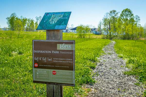 Continue on Jasper Highlands Blvd past Inspiration Park. Take 1st exit on Round about to River Bluffs Drive. Follow River Bluffs to 1115 River Bluffs, Blue house on the left just past the stone bridge.