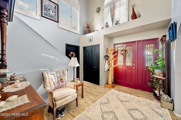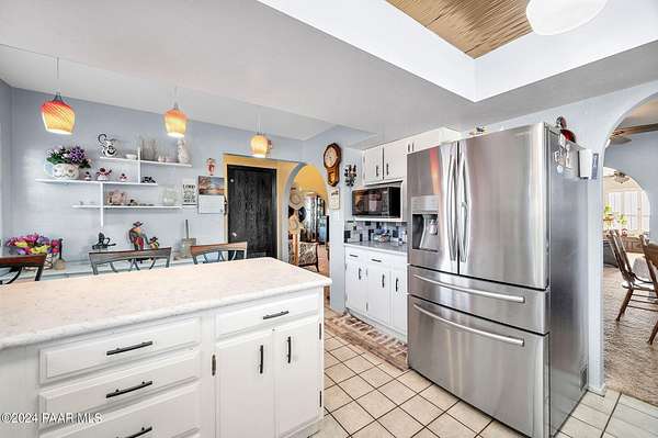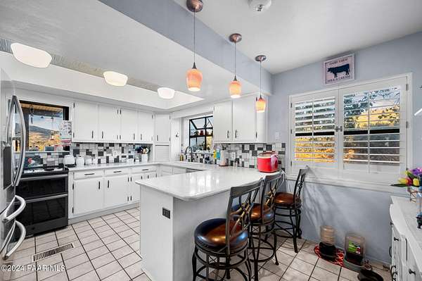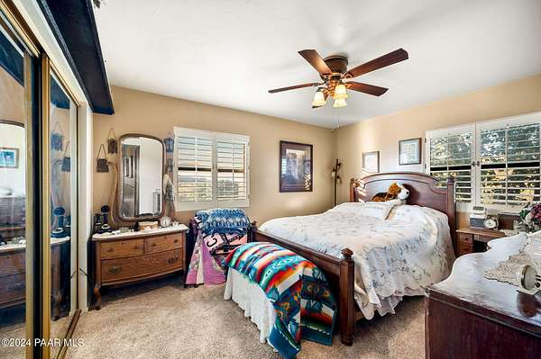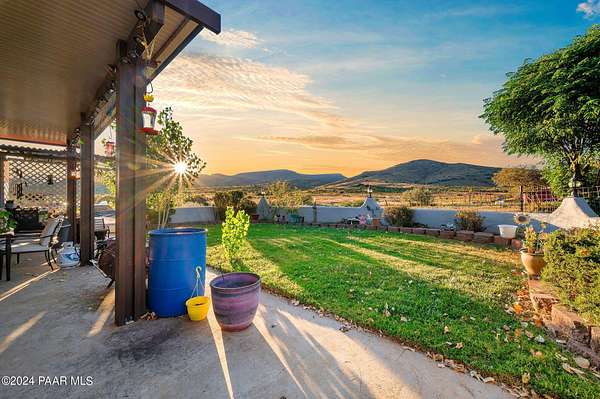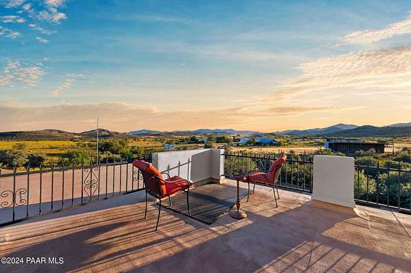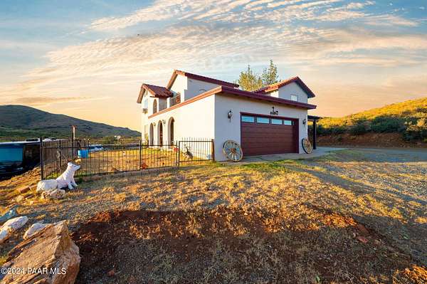 This 98-acre ranch offers a spacious 2,926 sq. ft. home featuring 4 bedrooms and 4 bathrooms, all set against breathtaking panoramic views. The main level boasts an updated kitchen with brand-new cabinetry and countertops, ideal for entertaining, along with a generous dining area, laundry, and two half baths.Upstairs, all four bedrooms provide comfort and privacy, including a primary suite with a beautifully updated bathroom and access to a private deck showcasing stunning vistas. Enjoy relaxing evenings in the hot tub or by the cozy wood stove. A new roof was installed in 2025.Additional features include a large unfinished basement for ample storage and a 3-car garage with space for a workshop. The property is horse-friendly with an open pen and borders both state trust land and BLM land, offering endless outdoor opportunities. Located just 5 minutes from Prescott National Forest, 40 minutes from Prescott, and about an hour from Phoenix, this property perfectly balances privacy with convenience. Sale includes two parcels.