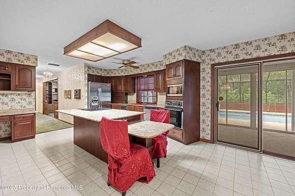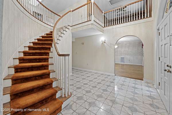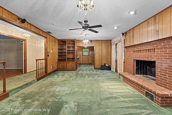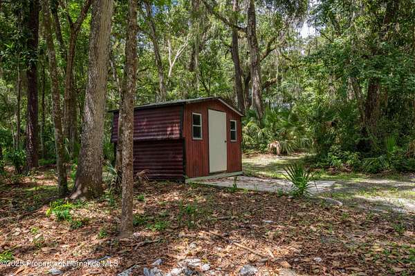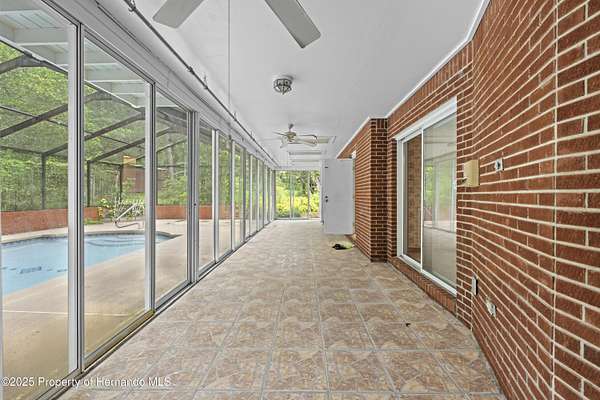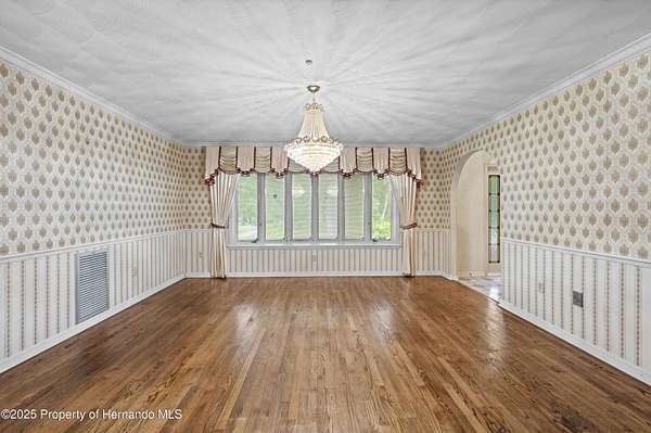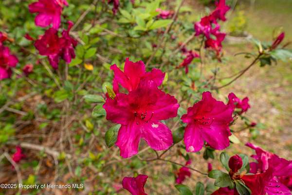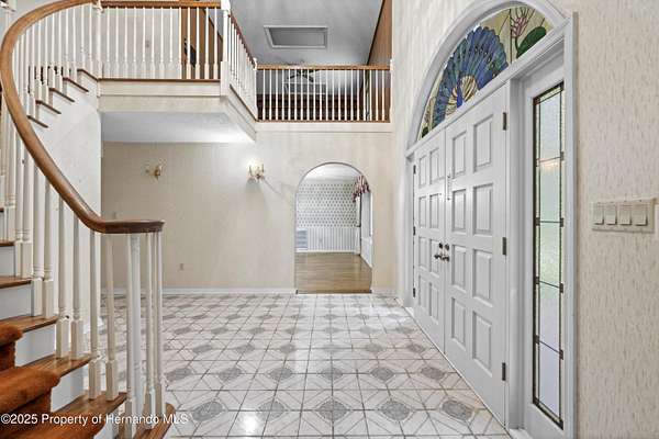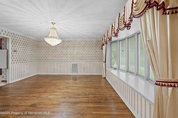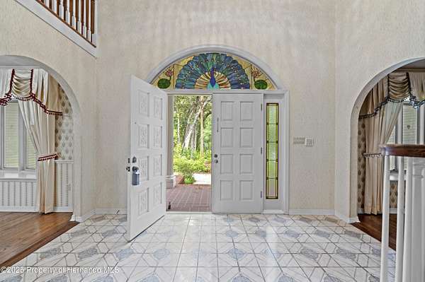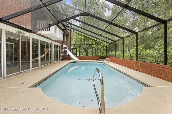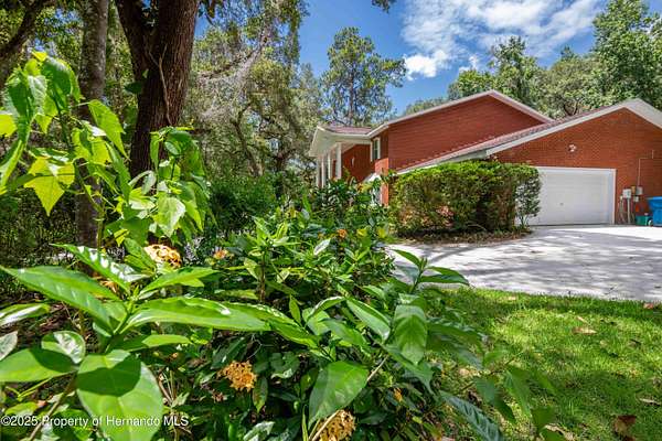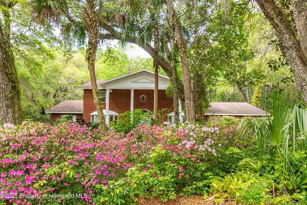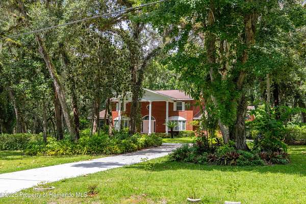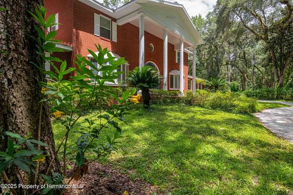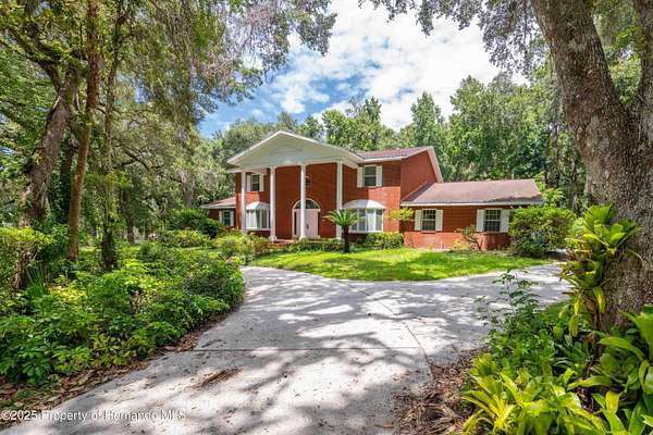Listed at appraised value!!! Step into timeless elegance with this custom-built British Colonial masterpiece, offering over 4,300 sq. ft. of air-conditioned living space plus an enclosed sunroom, spacious patio, and an oversized 2-car garage with additional storage. Set on 2.5 beautifully landscaped acres filled with fruit trees and flowering plants, this home offers space, privacy, and charm in equal measure. Built in 1983 by renowned builder Don Richards, the home features a solid brick exterior, a deep foundation, and unique architectural elements throughout. Inside, you'll find 5 bedrooms (including a spacious primary suite with private balcony), 4 full bathrooms, and thoughtful details that elevate every room-from 24-karat gold-plated fixtures to custom cut-glass accents framing the entryway. Enter through the tiled foyer with its soaring ceiling and arched doorways. The kitchen has been upgraded with granite counters and flows into a large laundry room and corridor. The living and dining rooms feature real polished wood floors, oversized bow windows, and elegant touches like a salon door and chandelier lighting. Relax in the sunken den, complete with rich wood paneling, a surround sound system, and a brick wood-burning fireplace. Adjacent, the bar/rec room boasts a tiled counter, wood paneling, and built-in benches with hidden storage. A cozy guest bedroom offers privacy in its own quiet corner of the home. Upstairs, the primary suite includes a carved wooden wardrobe, TV nook, and spacious bathroom with double sinks, dressing area, and balcony views over the backyard and neighboring farm. There are 3 additional generously-sized bedrooms, a study/library with built-ins, two smaller rooms perfect for hobbies or homework, and updated bathrooms with European bidets and dual sinks. Outside, enjoy your own private pool with a slide, electric heater, and an enclosed sunroom with lockable sliders and garden views. The home is equipped with 3-zone A/C, brand new water heater (2025), updated plumbing (2024-2025), and a durable roof in good condition. Additional features include: -Wired for alarm & intercom -Pool heater -Custom chandeliers (1 large, 7 small) -Attic storage -Colonial-style curved staircase -Iron security doors -Multi-use prayer room or pantry with built-in shelving This property is an exceptional blend of character, comfort, and craftsmanship. Don't miss this rare opportunity to own a true Brooksville gem!