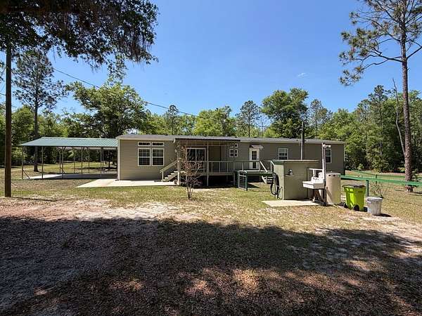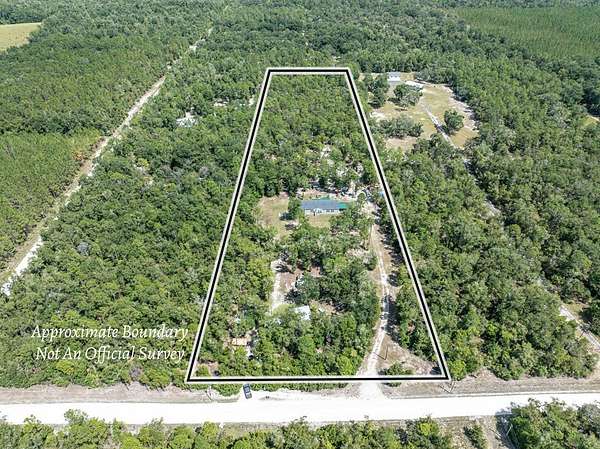 Look no further! This spacious 5 BDRM / 3 BA home offering 2,260 SF on 10 acres is the perfect private retreat. Nestled among native hardwoods and pines along a county-maintained limerock road, this private 10-acre tract features a cleared homesite surrounded by wooded acreage along the front, sides, and rear for exceptional privacy. Built in 2020, the main home offers a covered back porch—an ideal spot to unwind while watching deer and other wildlife. Inside, the thoughtfully designed split floor plan includes a large family room with a fireplace, separated by stylish barn doors from the dining and kitchen area, plus an additional formal living room perfect for entertaining. The home features 9-foot ceilings with transom windows, allowing for abundant natural light, along with tape and textured walls throughout. Vinyl flooring runs through the main living areas, while new carpet adds comfort in the bedrooms. The kitchen has been fully renovated and is a standout feature, boasting custom cabinetry, new appliances, Corian countertops, a cast iron farmhouse sink, stainless steel 4-door refrigerator, Bosch dishwasher, stone subway tile backsplash, and a large island with seating for four and built-in microwave with recessed outlet. The utility room off the kitchen provides access to the back porch and a generously sized pantry with floor-to-ceiling shelving and space for a freezer. The primary suite has been completely upgraded, featuring a beautifully renovated bathroom with a tile shower, soaking tub, and double vanity with upgraded custom cabinetry and Corian countertops. Additional upgrades include an improved hall bath and a convenient Jack-and-Jill bathroom between two bedrooms, while a third full bath is located off the hallway between bedrooms four and five. Major system updates include upgraded windows and HVAC system, offering improved efficiency and comfort. The property also features a utility shed, chicken coop, and an RV hookup with 50-amp service—perfect for visitors or additional flexibility. Located in the northern part of Gilchrist County, this property is just a short drive to the Santa Fe River and Suwannee River, as well as several nearby freshwater springs known for swimming, kayaking, and outdoor recreation. If you're looking for peaceful country living not far from a paved road—but with the feel of total seclusion—this property is a must-see. Schedule your private showing today and experience this unique retreat for yourself!