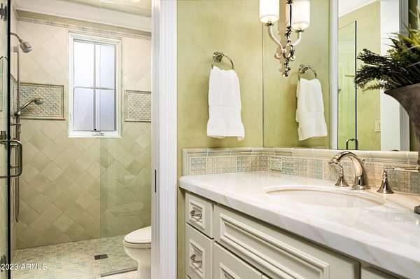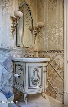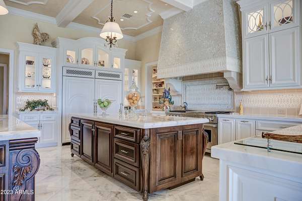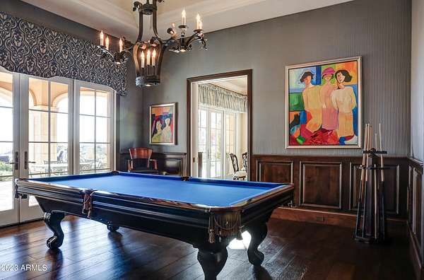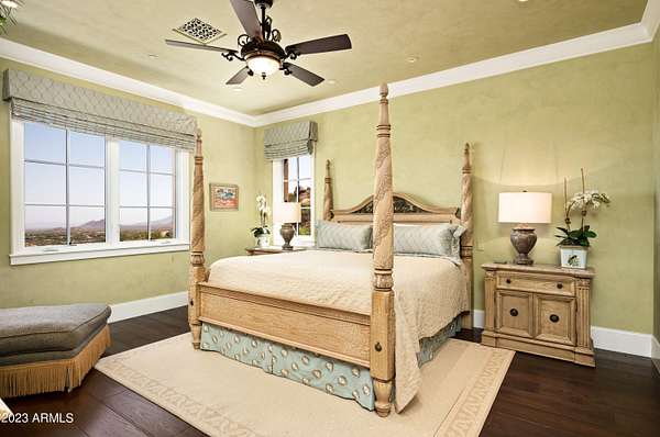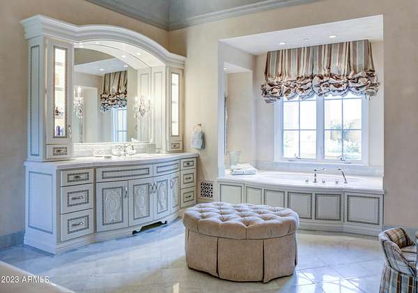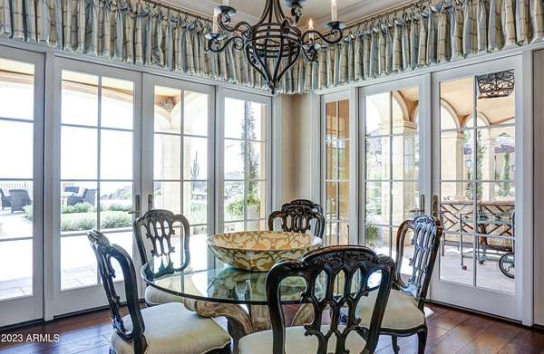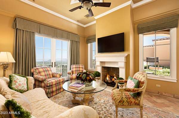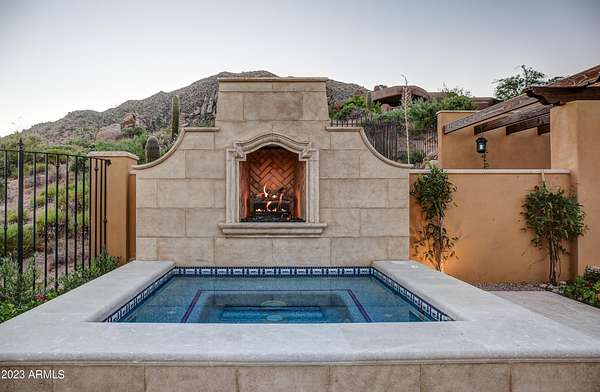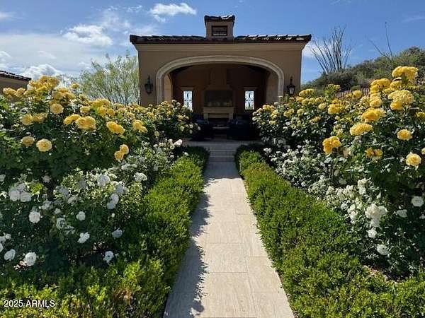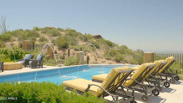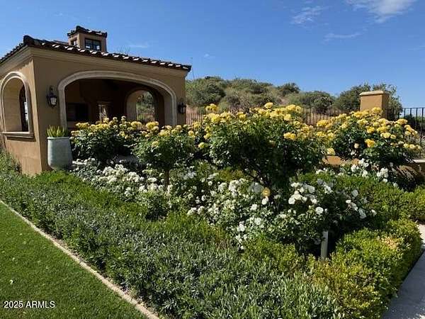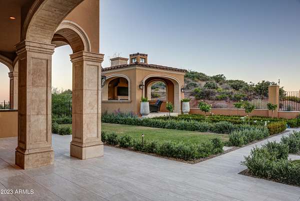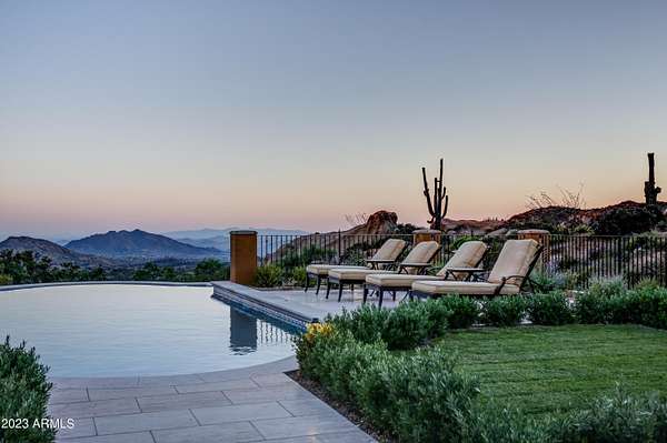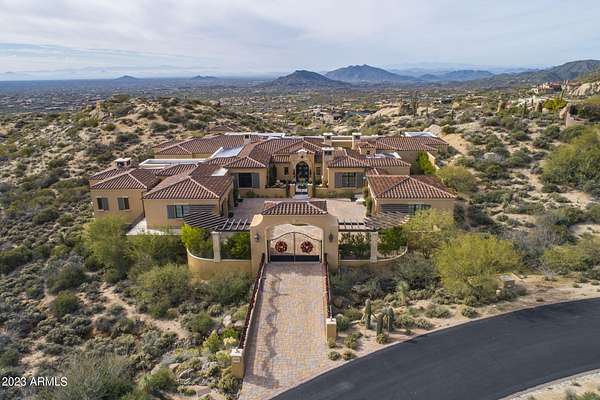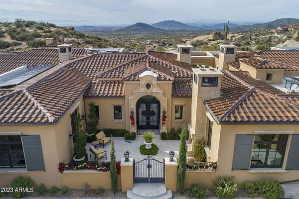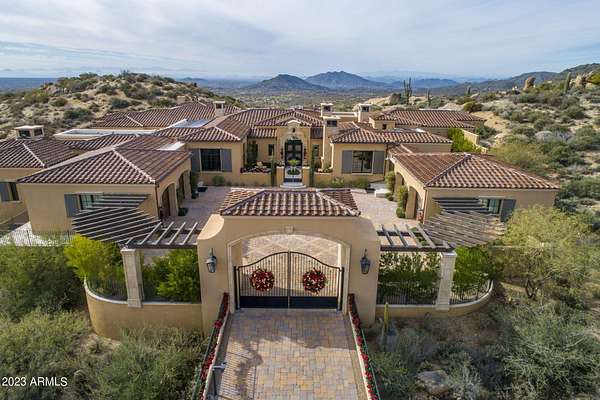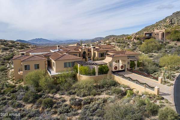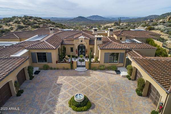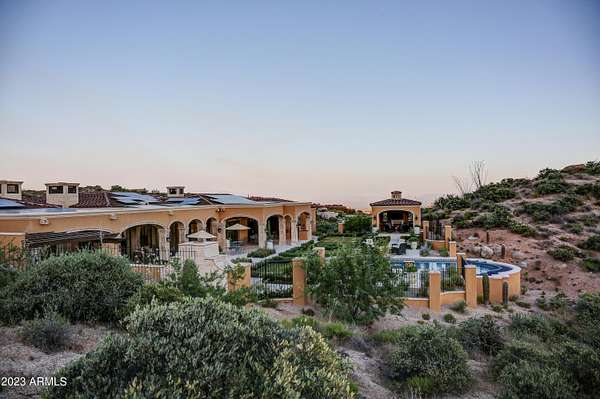 Spectacular Desert Mountain Estate with Golf Membership immediately available. Located in Apache Peak Preserve on 2+ private acres. Nestled among ancient rock formations. Amazing year-round Valley, sunset and city lights views! Ultimate curb appeal with gated porte-cochere and circular auto court. Magnificent gardens encompass colonnaded patios, ramada and spa deck. This single level home is a collaborative effort of 4 ''Masters of the Southwest'' for interior and exterior design, construction and landscape. Expertly curated fixtures, finishes, appliances, and smart home technology. 30-day membership application and approval process. The bridge and gated entry are just the beginning of the dramatic approach, enhanced by.gas lanterns, a bubbling fountain and circular auto court flanked by two garages housing 4 cars total. All leading to the entry courtyard with cozy hearthside seating and seasonal gardens The stunning great room features high ceilings, a deep crown moulding accented with clerestory windows, a grand marble hearth and a bank of European French doors all opening to the colonaded veranda and Valley views. The formal dining room is appointed with built-in, lighted display cabinets and a show-stopping double wine cellar symmetrically flanking the room. A Chef's Kitchen boasts beautiful white cabinetry with lighted displays, a double island, quartzite counters, ideal cooking layout, large pantry and commercial walk-in cooler. Elegant executive library features coffered ceilings and custom built-ins. Finely appointed Primary Bedroom and Spa Bath with marble counters and custom Italian tiles. Family and friends readily gravitate to the roomy yet cozy billiards/media room immediately accessible from the kitchen and patio/pool, complete with mixologist's outfitted serving bar. Guest suites and Casita are spacious and appointed in Chateau-Relais style. The stunning veranda, pool, gazebo and gardens are reminiscent of a Cap Ferret holiday setting, all overlooking unencumbered views of the Valley of the Sun. A generous artist's studio with French windows for natural light is tucked away below the Casita...perfect also as a music studio. It is accessed by an elevator. Separate patio for furry friends is complete with grass, rose garden and a potted kumquat orchard! European-inspired stone fire places are found throughout the exterior courtyards, Great Room, Primary Bedroom and Casita. White oak and marble flooring, European tiles, banks of French doors, impressive mouldings, and elegant fixtures are distinctive features that set this home apart. Smart home features include Savant System and an extensive solar panel array. Plan soon for a private visit of this masterpiece: imagined by the owners in collaboration with Candelaria Design, Manship Builders, Ashley P Design Interiors and Enchanted Gardens. Golf membership available through application to the Club. Purchased from the Club through Escrow. Allow for a 30-day approval process with the Club membership office.