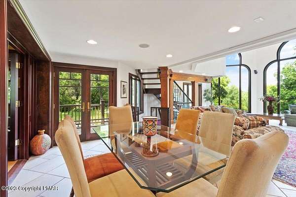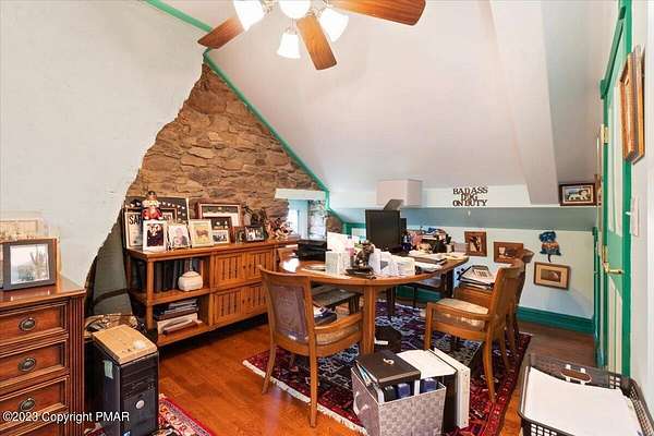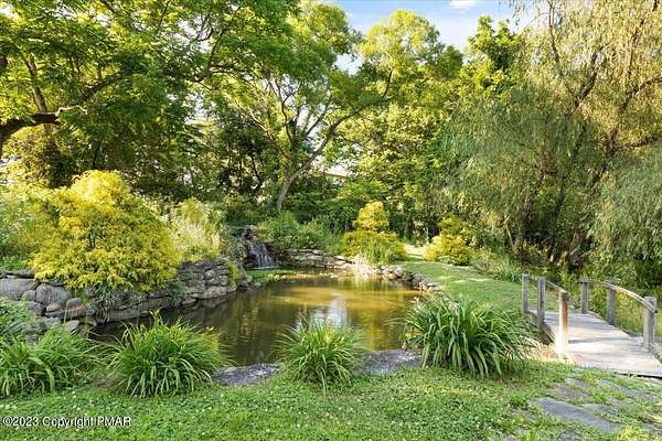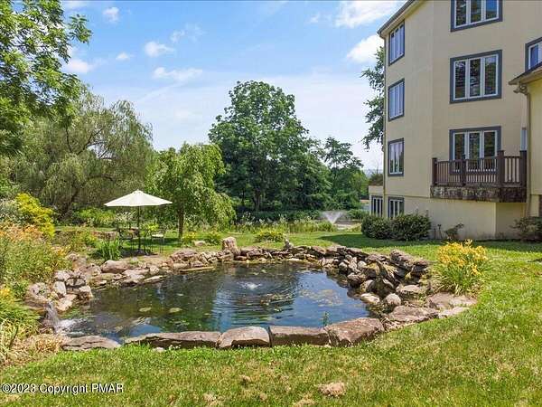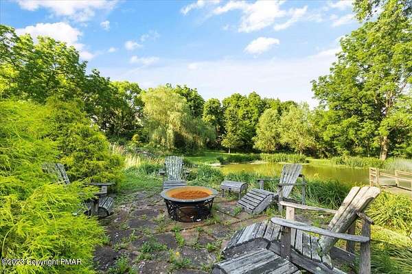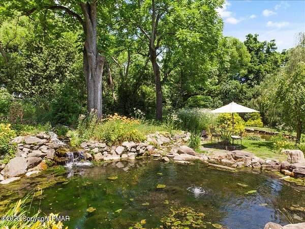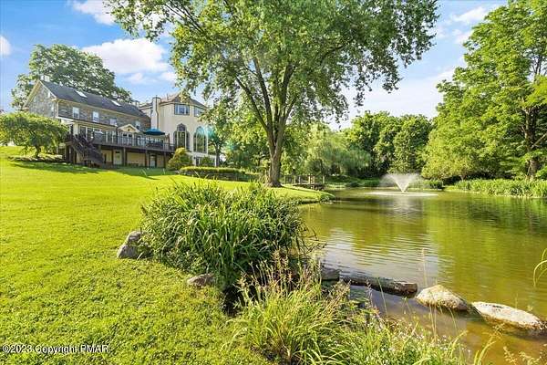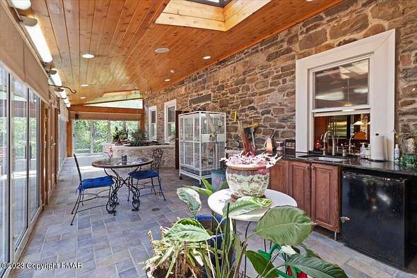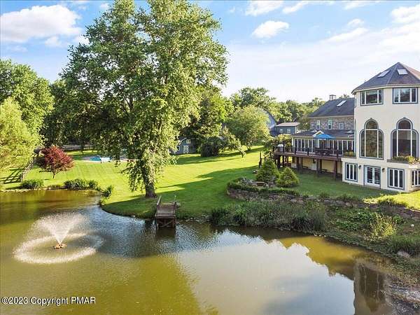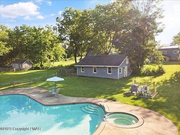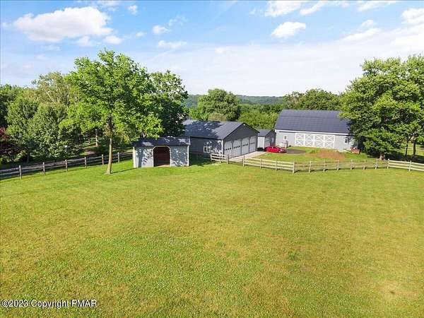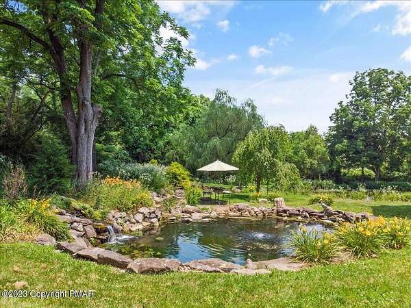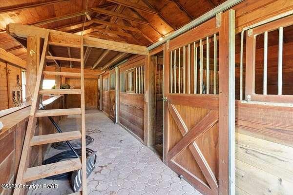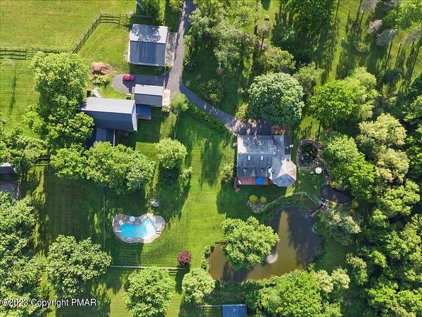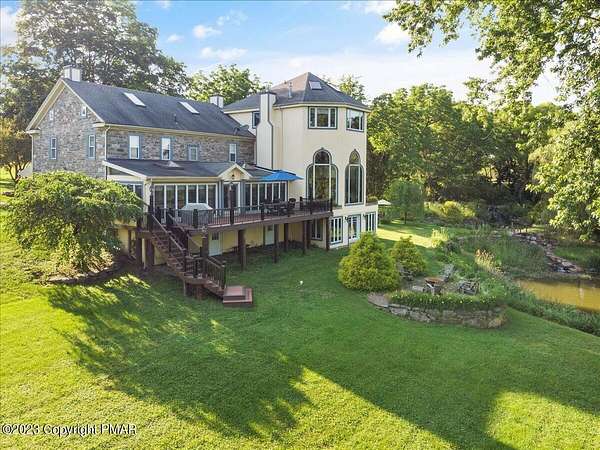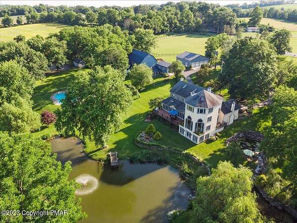 Charming Stone Farmhouse on 29.49 acres in Mt Bethel PA. Beautiful architecture melds a 1700 farmhouse, completely renovated to an addition four story high, hosting a fantastic living space. Panoramic views, from sun room, Cathedral ceilings and windowed Great Hall, plus wrap around porches, all give plenty of entertaining areas for guests, a versatile oasis! The ''Cook's'' kitchen, is generously equipped and beautifully laid out with top appliances and formal dining room. 2 primary suites, one with FP, 4 Bedrooms, 3 Full baths, Library and office, and lower level walk out suite with gym. Gorgeous lush landscaping, gardens and waterfalls, a pond with dock, forested stream and a sleek heated in-ground pool. The farm hosts two beautifully maintained stables with 7 stalls, 2 run in sheds, 5 fenced pastures with Nelson waterers, and shade trees, and a 250'x100' riding arena. Finally, a stately hewn wood raftered 2 story Bank Barn with tack room, and 3 car Garage, with artist's studio and office add beauty and farm pride, and one more treat- a Pole Barn offering enough space for 8 cars and farm/family equipment.