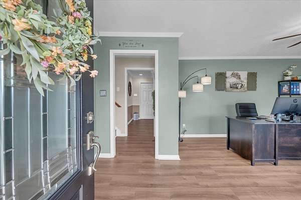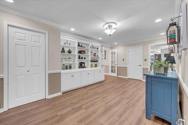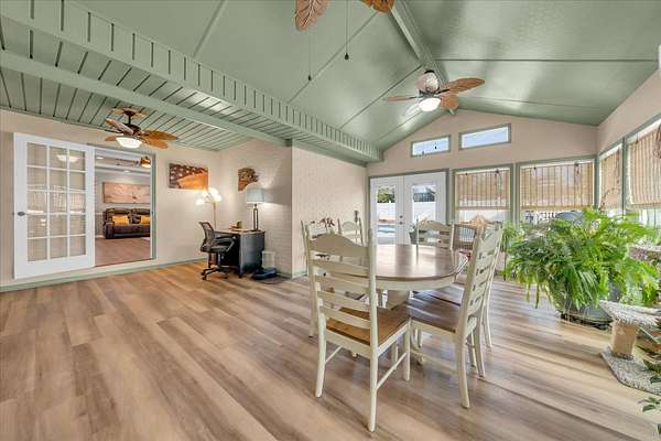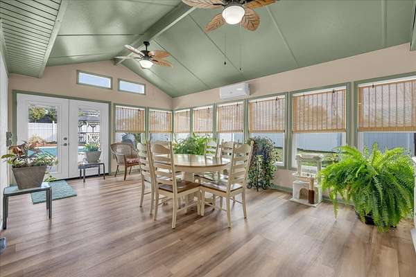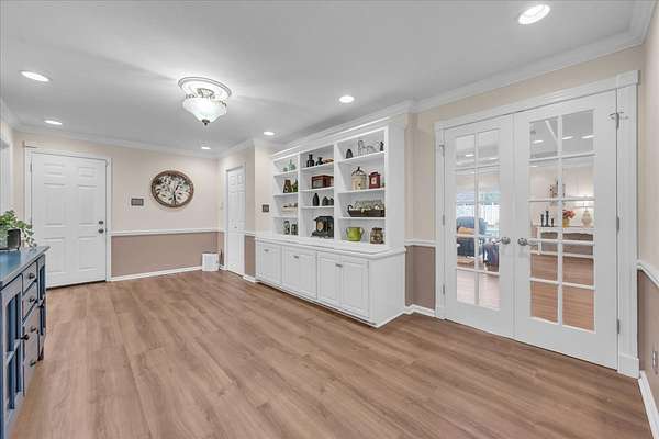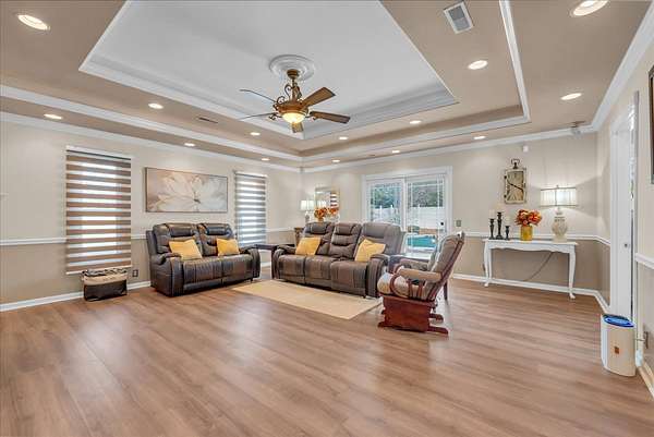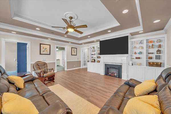 Inside, you'll find a thoughtfully designed floor plan featuring a formal dining room, dedicated office, spacious living room, and an enclosed sunroom that provides additional space for relaxing or hosting guests. The large main living area showcases trey ceilings, custom built-ins, an electric fireplace, and sliding glass doors that open directly onto the pool patio for seamless indoor-outdoor living.