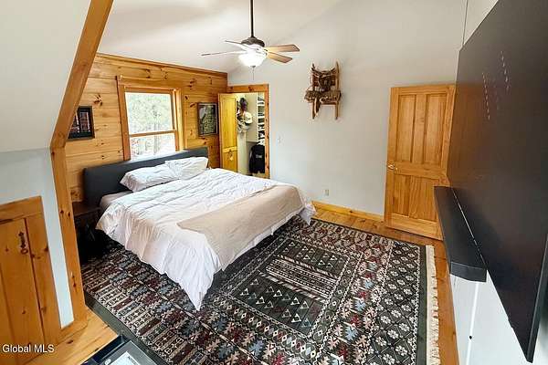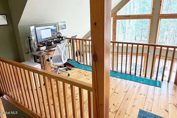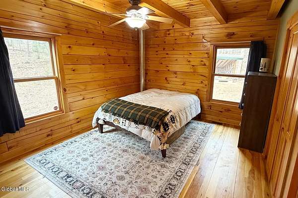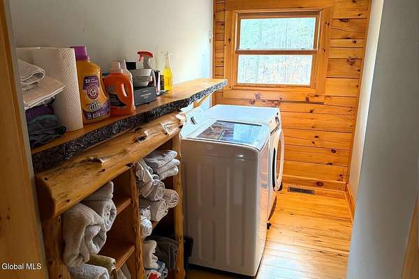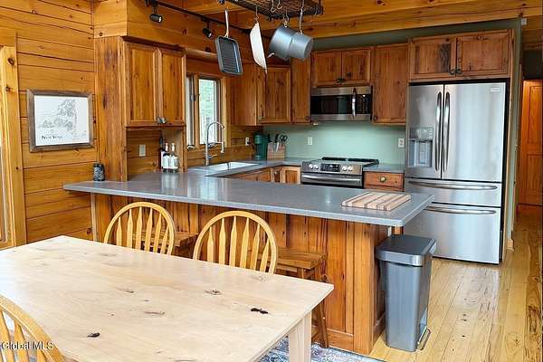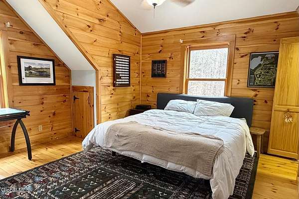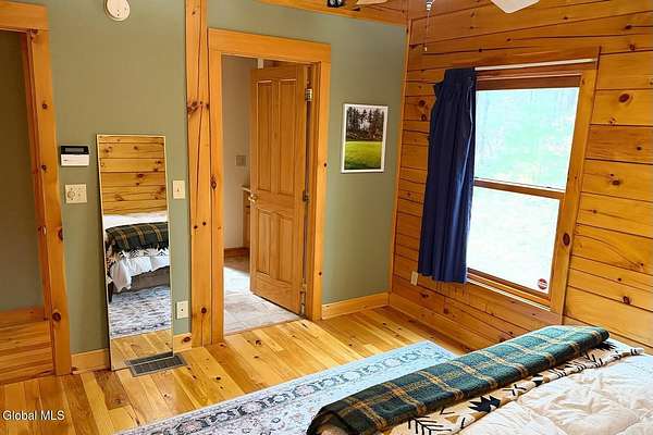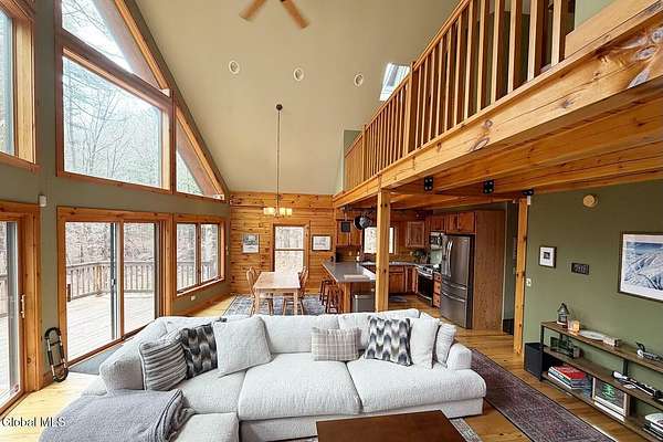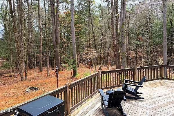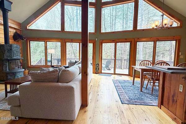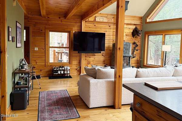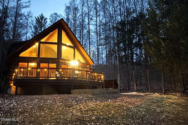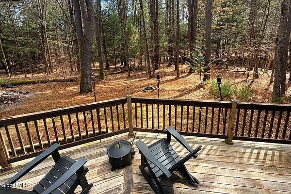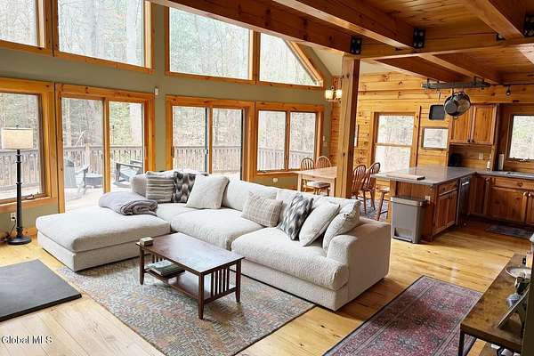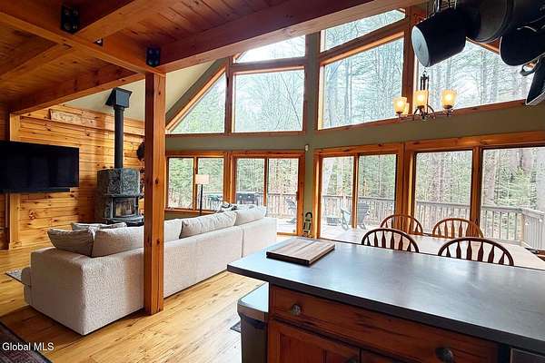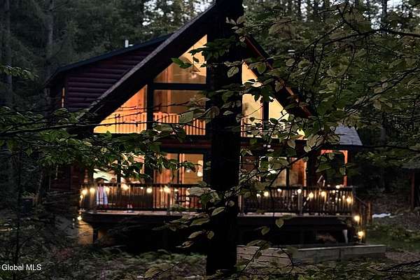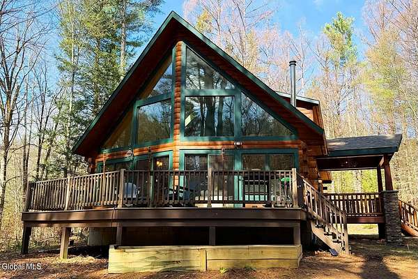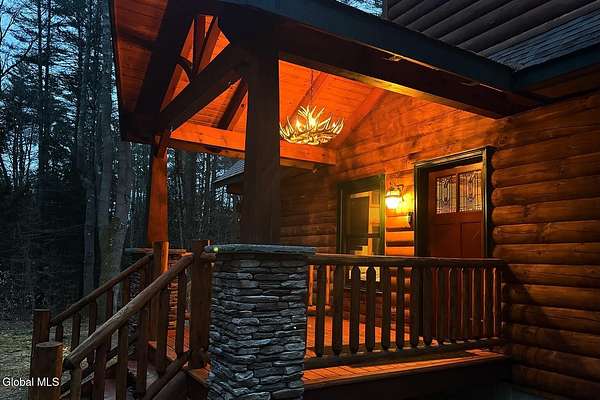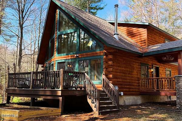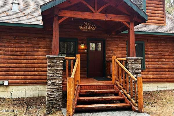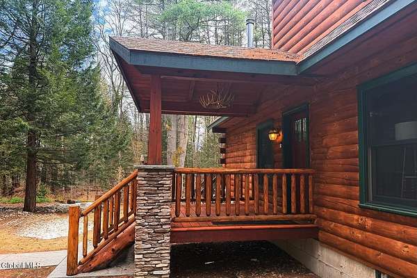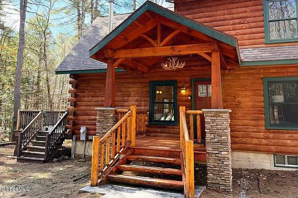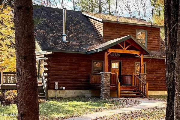Custom built and meticulously maintained log home nestled on just under 5 acres. This quiet and peaceful retreat is located just 10 miles from Saratoga, approx 20 miles from Sacandaga Lake, and approx 14 miles from Lake Desolation. With 3 bedrooms and 2 full baths this home boasts an open, sun-lit floor plan with an incredible wall of windows, bringing the beauty of the surrounding nature right in to your living room. Enjoy the beautiful Tulikivi fireplace made from original Finnish soapstone, keeping the heart of the home warm and cozy. Newer high-end stainless steel appliances; hardwood floors made from locally sourced Hickory and custom decorative kitchen cabinet handles made from river rocks sourced from the Ausable River in Lake Placid. This custom home is a MUST SEE with unparalleled craftsmanship