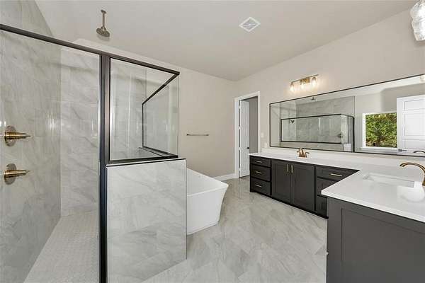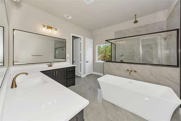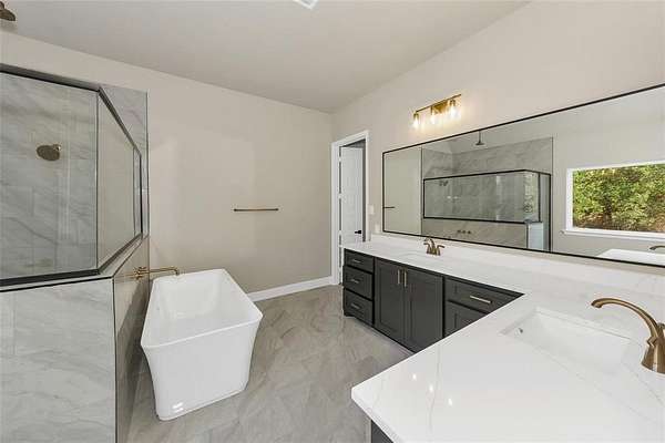 Inside, you'll find hand-scraped hardwood floors, quartz countertops, and deep, rich dark chocolate cabinetry with champagne brass hardware. The open-concept layout features a 3-way split bedroom floor plan, a primary retreat with a spa-inspired bath including a soaking tub and rainfall shower, and a huge primary closet with direct laundry room access.