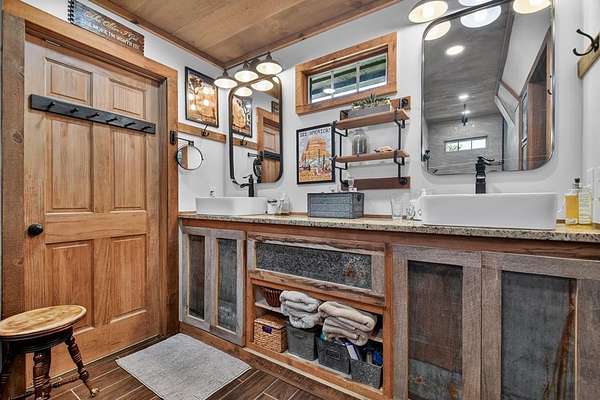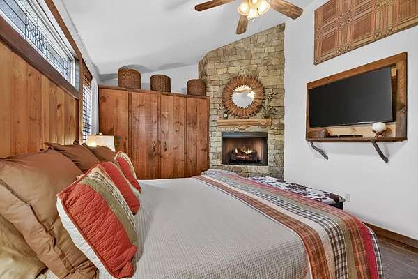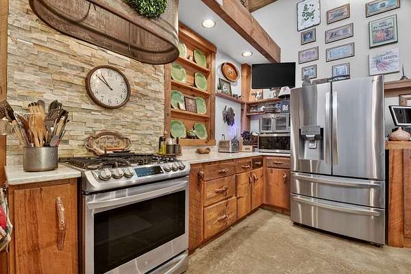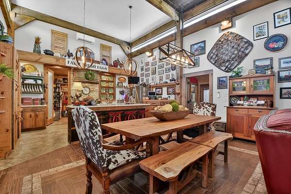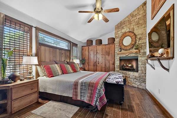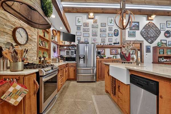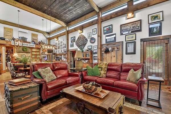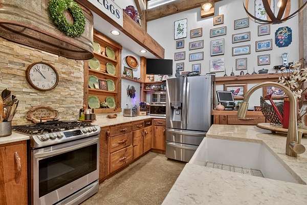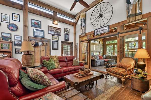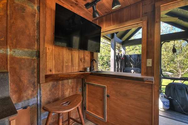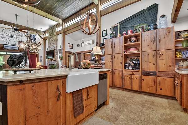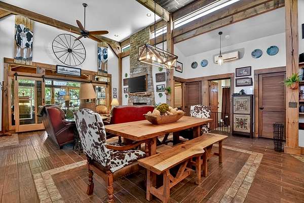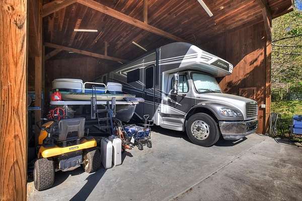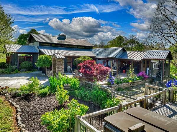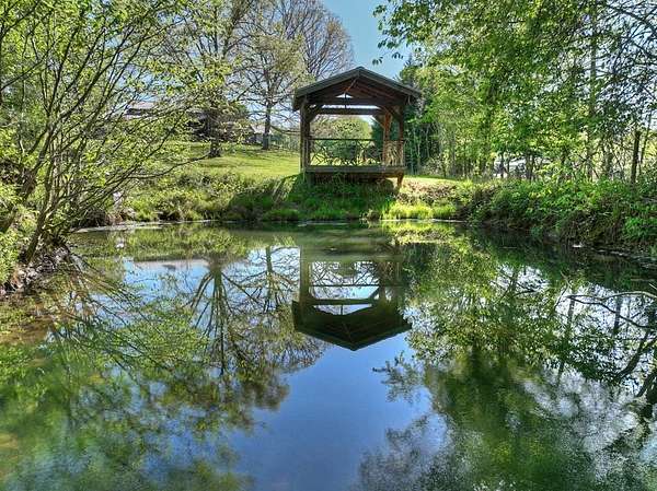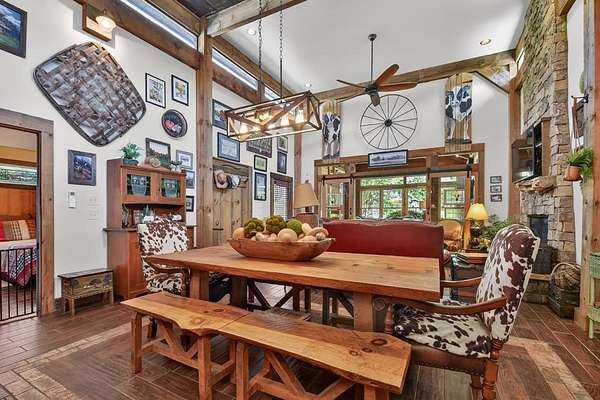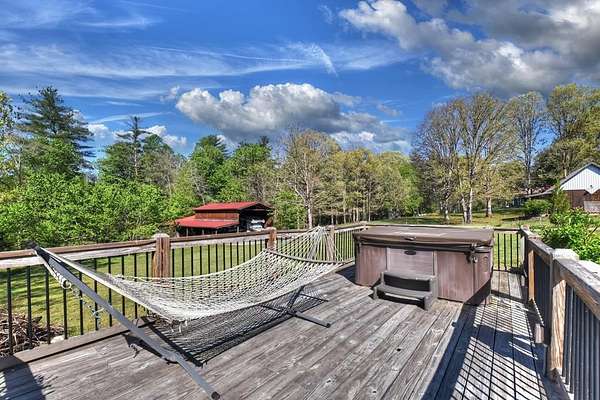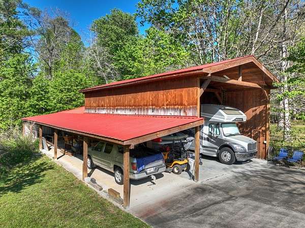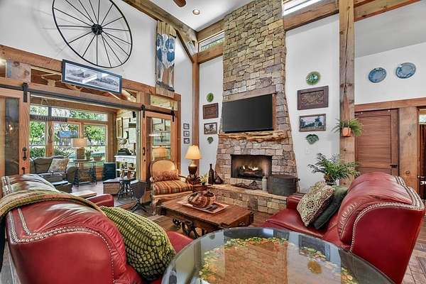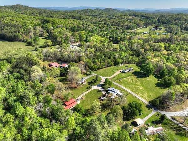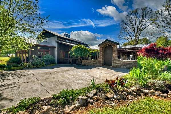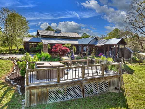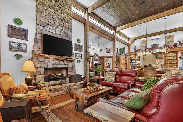 Thoughtfully designed timber-frame home showcasing exceptional craftsmanship and rustic character throughout. Features include a light-filled sunroom, soaring 16-ft ceilings in the living area, radiant floor heat across the main living spaces, tile flooring, and a dramatic floor-to-ceiling stone fireplace. The kitchen offers custom hand-finished cabinetry, quartz countertops, and a dual-fuel range. The spacious primary suite includes vaulted ceilings, stone fireplace, custom closets, walk-in closet, and a private bath with stepless shower and double-vessel vanity. Flexible additional spaces provide room for guests, office, or hobby use. Enjoy year-round mountain views, a beautiful pond with pavilion, gentle level usable property, easy access, whole-house generator, oversized garage designed for boat and RV storage, plus a workshop located at the rear of the garage/carport. Conveniently located close to Blue Ridge Lake, Lake Nottely, the marina, and area recreation—ideal for full-time living or a private mountain retreat.