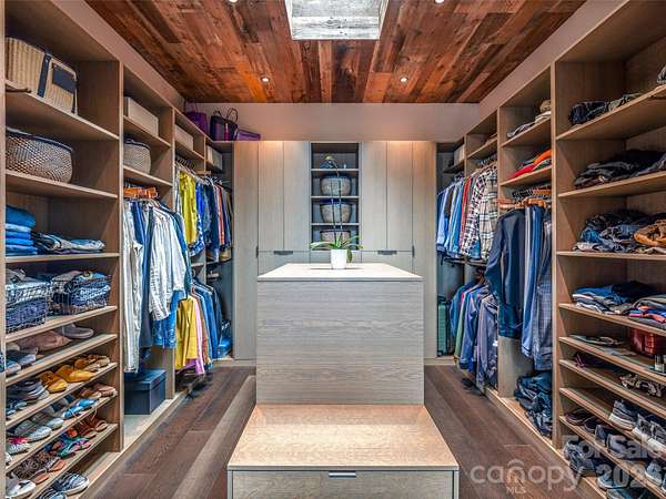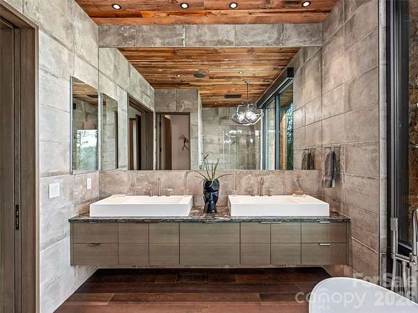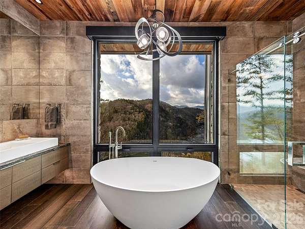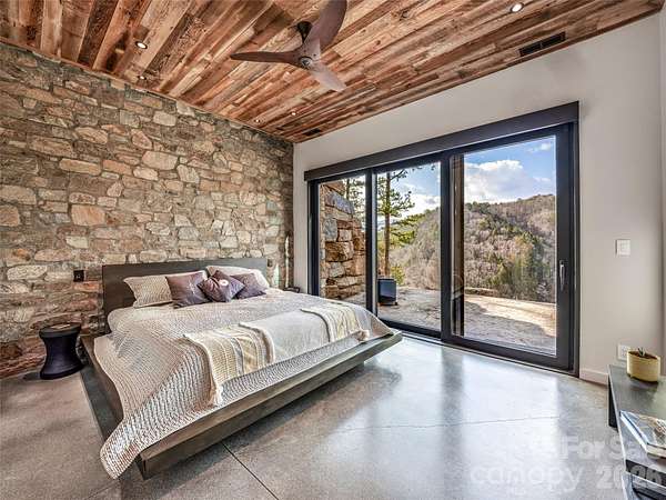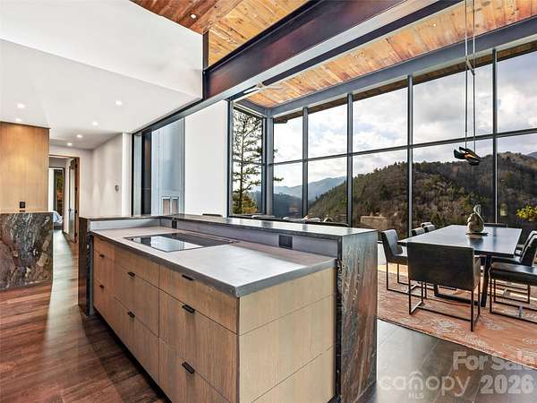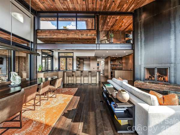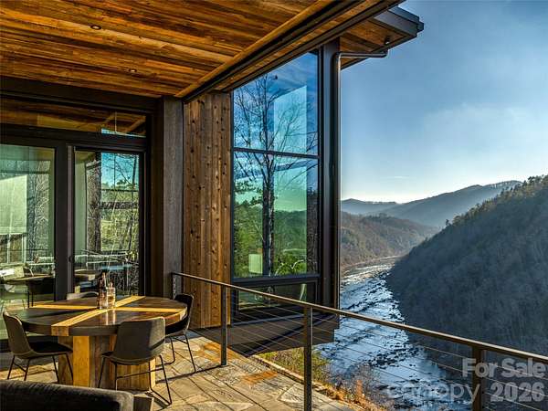 Nestled on a sweeping bend of the French Broad River, 112 Moon Shadow Lane is a stunning mountain-modern retreat designed by renowned architect Platt. Situated within the coveted gated community of French Broad Crossing, this sanctuary is celebrated for its privacy and conservation. Designed to harmonize with its surroundings, with expansive river and mountain views, walls of glass, provide an immersive and tranquil living experience. The interior showcases natural materials and meticulous craftsmanship at every turn. Soaring reclaimed hemlock ceilings throughout, stone accents and sculptural steel fireplaces infuse warmth and texture, while custom cabinetry and refined finishes elevate everyday living. The great room seamlessly flows into a chef's kitchen crafted for both artistry and functionality, featuring grain-matched cabinetry, leathered granite concrete countertops, premium appliances and a dedicated wet bar-perfect for gatherings that extend into the evening. Indoor and outdoor living blend effortlessly here. A retractable screened porch with a wood-burning fireplace provides an outdoor retreat, while several terraces and patios provide front-row views of the river below. The main-level primary suite sanctuary features its own terrace overlooking the water and a spa-inspired bath. Versatile living spaces include a loft office with river vistas, guest or fitness suite and a lower-level recreation area seamlessly connecting to a full-length patio and bocce court. Thoughtful amenities, including a wine room, secondary wet bar, lower-level laundry, in addition to the main level laundry, and multiple en-suite bedrooms. Surrounded by meticulously curated native landscaping, stone pathways, and serene outdoor nooks, this property is both tranquil and sophisticated. While it feels secluded, it remains convenient to Marshall, Hot Springs, Weaverville, and Asheville, offering access to dining, culture and essential conveniences. In addition to its architectural integrity and natural beauty, this home is equipped with a 3+ car garage, elevator for access to all levels, and a generator and a lightning protection system for peace of mind. 112 Moon Shadow Lane embodies a riverfront lifestyle distinguished by exceptional design, natural beauty and lasting value-a rare opportunity to own a legacy property where craftsmanship and nature coexist in perfect harmony.