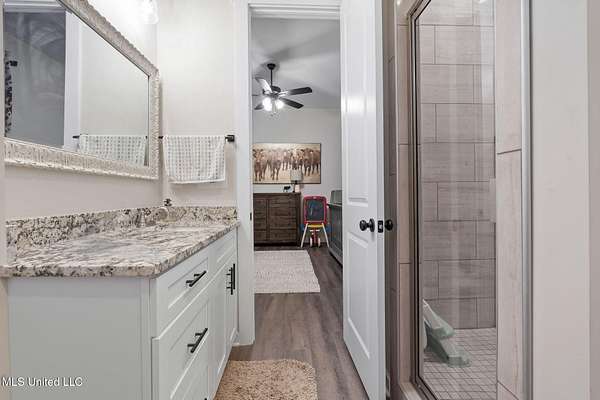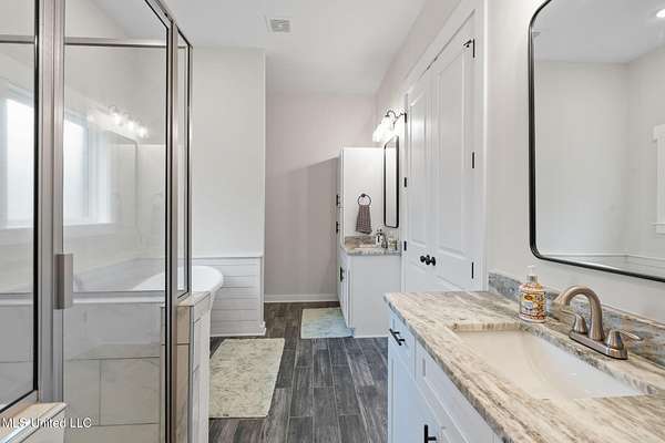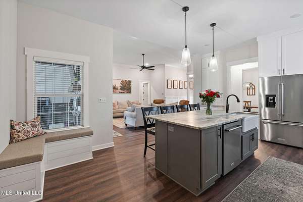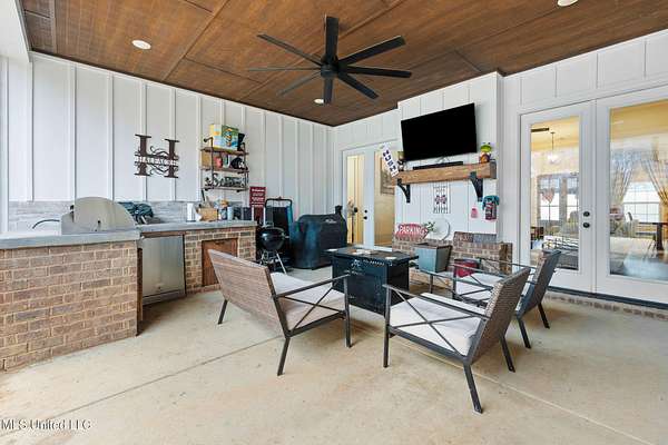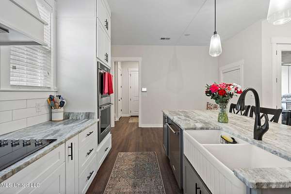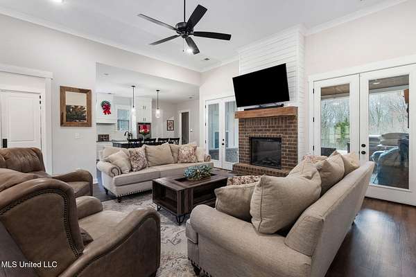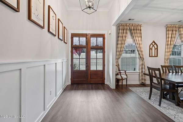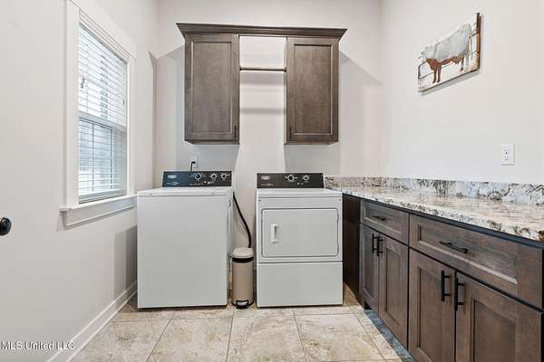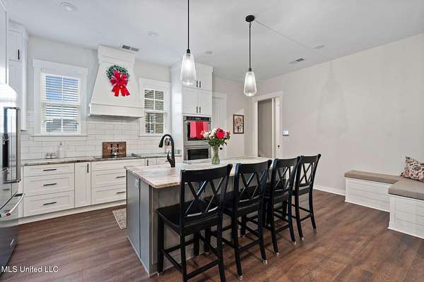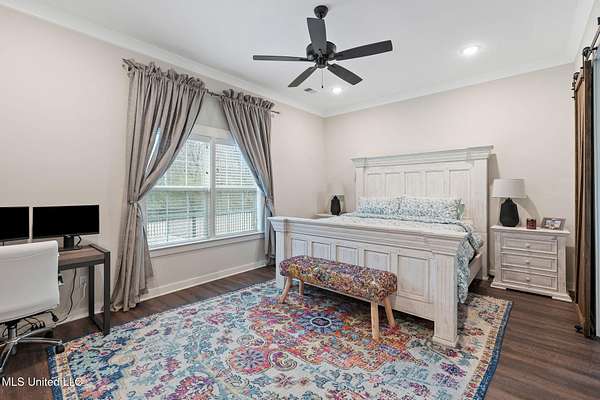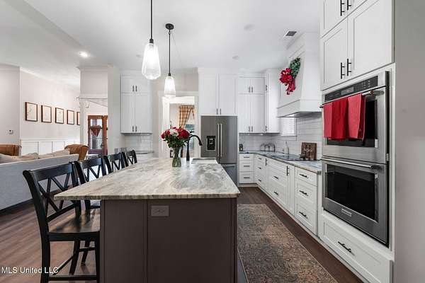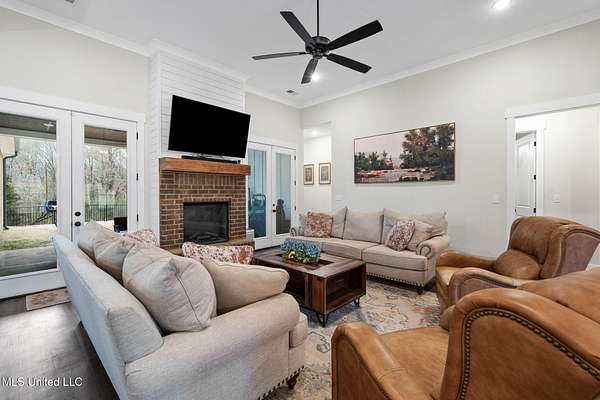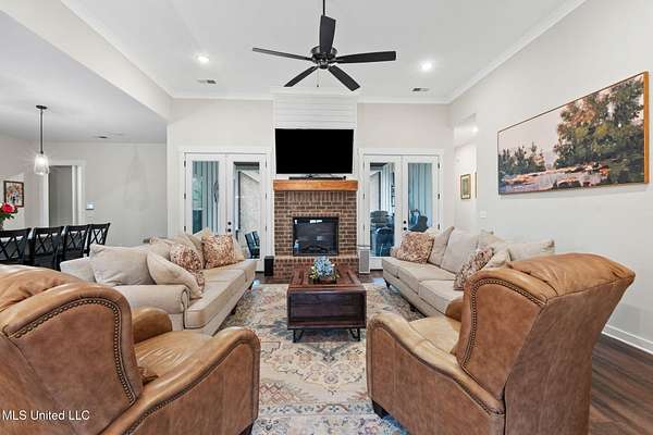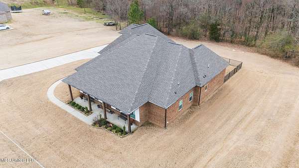 Beautiful Home located in Established Neighborhood sitting on 1.5 meticulously manicured acres provides luxury living, space and privacy. The residence features three bedrooms and two and a half bathrooms, all conveniently situated on a single level. An unfinished expandable area is available upstairs, offering potential for future customization or additional living space. The home's open plan design creates a welcoming and spacious atmosphere. The kitchen is equipped with a walk-in pantry, tiled backsplash, and stainless steel appliances, including double ovens, large island with breakfast area, granite countertops that add a touch of elegance. The kitchen, complete with an island, seamlessly connects to the great room, making it ideal for entertaining and everyday living. The luxurious Master Suite is enhanced by a ceiling fan, disc lighting, and crown molding, creating a refined retreat. The Master bathroom offers two separate vanities, a soaking tub, a walk-in shower, and an expansive walk-in closet. Other extras include a formal dining room for family get-togethers or entertaining, nice sized secondary bedrooms, a half bath for your guests, a laundry room that features abundant cabinetry, a designated hanging area, and a long countertop for folding laundry, a drop station off the garage, a double door foyer entry adorned with custom molding work, adding a sophisticated touch to the home's entrance. Outside you will enjoy a large covered front porch, a spacious, covered back porch that includes a ceiling fan, LED lighting, and a dynamite outdoor kitchen, ideal for outdoor dining and entertaining. Home has plenty of parking space and the wrought iron fenced area in the back leaves the awesome view of the wooded area behind the home yet still perfect for pets or the little ones.
