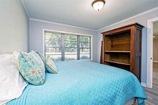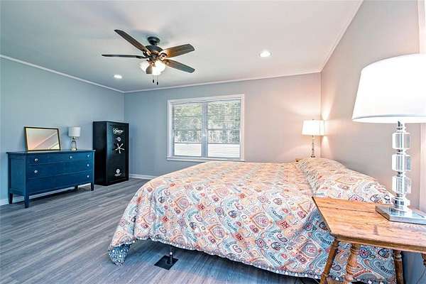 The kitchen includes modern stainless steel appliances, fresh counters, and classic wood cabinetry, while the bathrooms offer a unique blend of mid-century style and modern renovations. The primary suite is spacious and inviting, with plenty of room to relax. Updated flooring throughout much of the home adds a fresh touch.