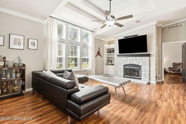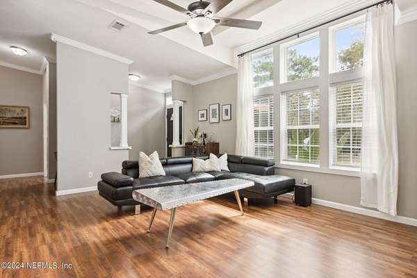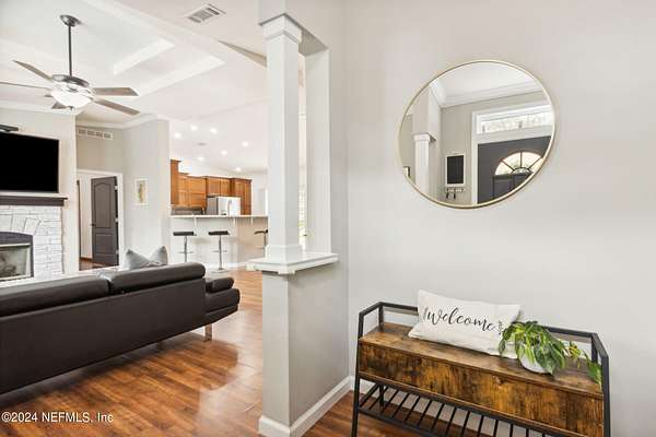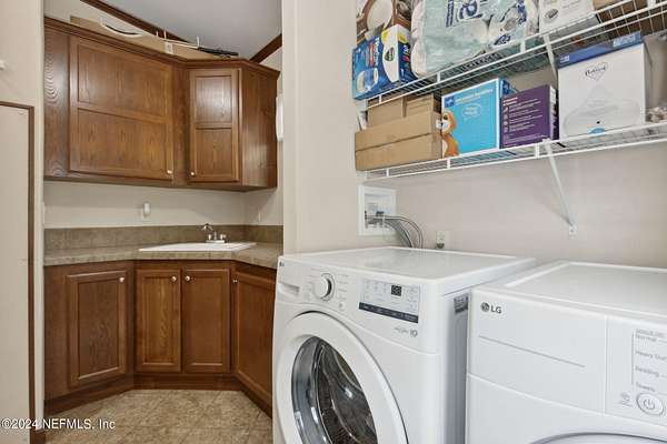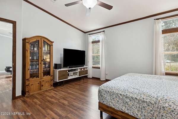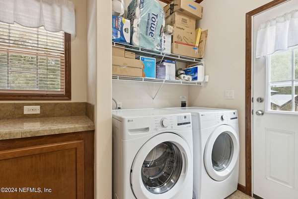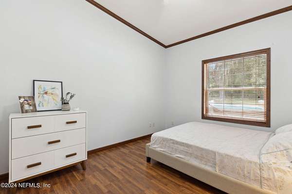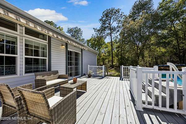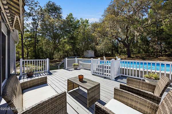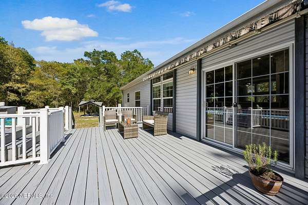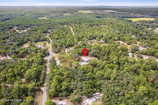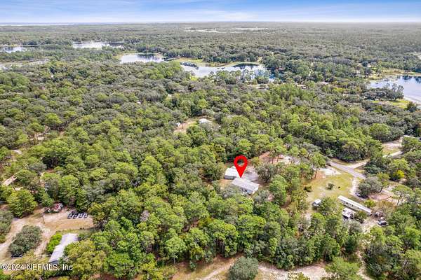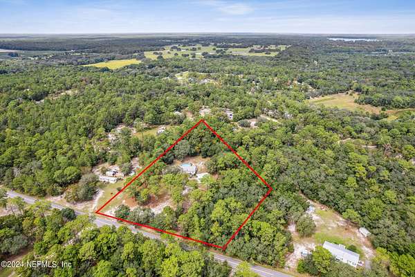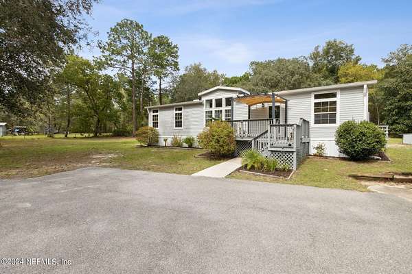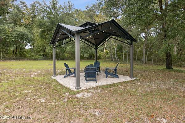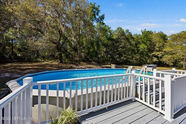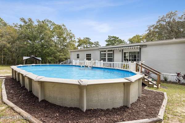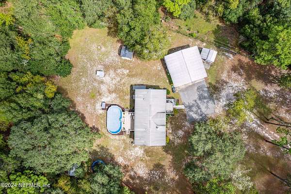 Bring the RV, boat, animals, and all the toys to your PRIVATE 4-ACRE retreat on HIGH AND DRY land. This property features a 34.5' x 28' x 12' THREE-BAY CARPORT with ATTACHED WORKSHOP/GARAGE, TWO SHEDS, and a 30 AMP RV HOOKUP. Approximately 2 ACRES are FENCED, with 1.98 ACRES WOODED and UNFENCED for added flexibility. GATED entry and 360 degrees EXTERIOR SECURITY CAMERAS provide privacy and security. Enjoy outdoor living with an ABOVE-GROUND POOL, WOOD DECK, SAFETY FENCE, RETRACTABLE AWNING, and NEWER POOL PUMP. A GENERATOR PLUG WITH TRANSFER SWITCH allows for easy backup power. Inside, the METICULOUSLY MAINTAINED home offers NEW AC, NO CARPET, VAULTED CEILINGS, LARGE WINDOWS, and CROWN MOLDING. The KITCHEN includes STAINLESS STEEL APPLIANCES and a FARMHOUSE SINK. WASHER AND DRYER INCLUDED. Situated on a CONCRETE SLAB and conveniently located near Jacksonville, Gainesville, Ocala, and Orlando.