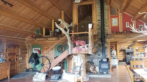 10.15 Acres end of the road privacy, surrounded by pine and cedar trees. Come live and work from this multi-use property. Custom Log Home 2387 sq ft hardwood floors, vaulted ceilings and floor to ceiling windows fabulous views throughout the property. Unique staircase to the loft bedroom ensuite with huge, covered porch to enjoy the country view. Main level living room, dining room, large country kitchen with wood cooking stove and electric range and walk-in pantry. Master bedroom ensuite and covered deck to the back yard cedar grove. Main level bath with shower and clawfoot tub. Second bedroom on main level. 288 sq ft basement great for storage or wine cellar. Off of the dining room French doors to covered 22x20 deck overlooking the first of 3 ponds. The second pond is 30 feet deep and home to blue gill trout and goldfish. Abundance of waterfowl white tail and turkeys. 16x16 greenhouse, 3 acres fenced with barn. Fenced garden with an orchard of pear, apple, and plum. 40x60 Shop with propane and wood heat. 1/2 bath, office space, with hoist and paint room. 46x24 attached carport. 53x60 machine shop. 9x60 Woodshed and storage shed. Terrific producing Spring for household use and irrigation. This property has it all it just needs You!
