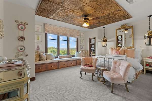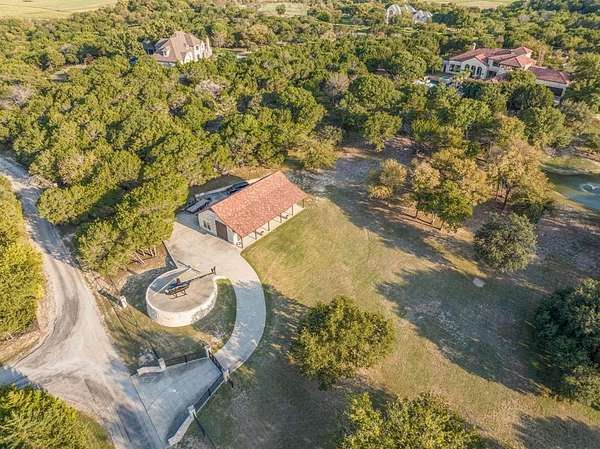 A one-of-a-kind Hill Country-inspired estate nestled in the exclusive gated community of Trinity Bluffs Estates. Set atop a bluff on over 5 acres of breathtaking land, this home offers unrivaled privacy and scenic beauty. Warm and welcoming, this architectural masterpiece is designed for both comfort and luxury, with 7,733 square feet of living space in the main house. It features 4 bedrooms, 4 full & 2 half bathrooms, a theater, and multiple living areas. The pool house, which doubles as a guest or in-law suite, adds an additional 1,159 square feet with an open-concept living area, kitchen, 1 bedroom, and 1 full bath. The outdoor amenities are just as remarkable, with expansive porches, a stunning pool, spa, tranquil water and fire features, a private pond, and panoramic views that create the perfect setting for entertaining. Additionally, the property includes an expansive 1,800-square-foot barn, perfectly suited for extra living space or storage, complete with a helicopter bay and helipad, which can be converted to a horse barn. Located in Aledo ISD and outside city limits.