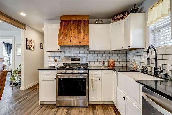 Cute bungalow in quiet town! Move in ready. Large lot. Complete remodel on this 1940 home! Wooden beam header separates the living/dining creating an open floor plan with wood flooring extending throughout. Absolutely STUNNING kitchen remodel including white subway tile backsplash, granite counters, farm sink, wooden vent hood over gas stove, stainless steel appliances and more! Master bedroom, full bath and utility room downstairs and 2 bedrooms plus living spaces upstairs. Large wrap-around deck in back with a chain-link fenced yard. Large lot includes circle drive and plenty of parking. Updates include: Water Heater 2014, New Roof 2017 (50yr shingles), Kitchen Remodel 2018 and plumbing/wiring updated throughout. This home is a doll house just waiting on a new family! Call today for an appointment!