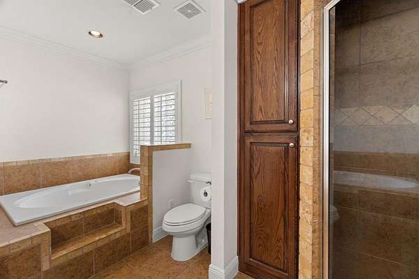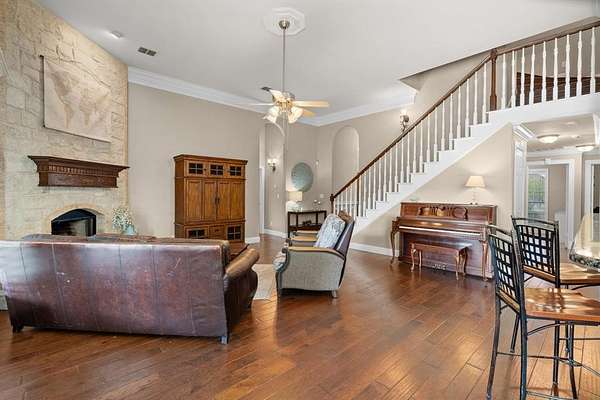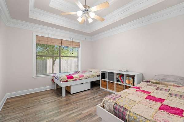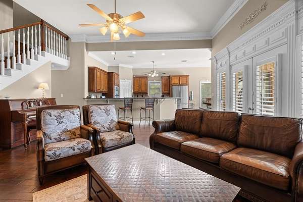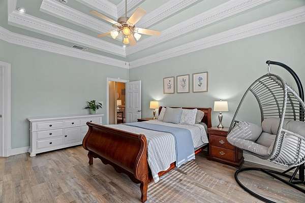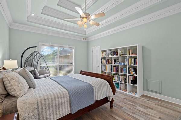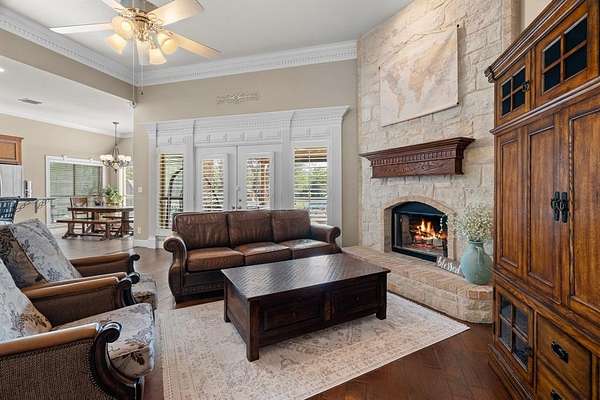 Inside, the home is just as impressive and meticulously maintained. Offering two primary suites, three additional bedrooms, and three full bathrooms, this layout is perfect for multi-generational living or guests. Enjoy a game-media room, private office, and upscale finishes like wood flooring, triple tray ceilings and elaborate moldings throughout.