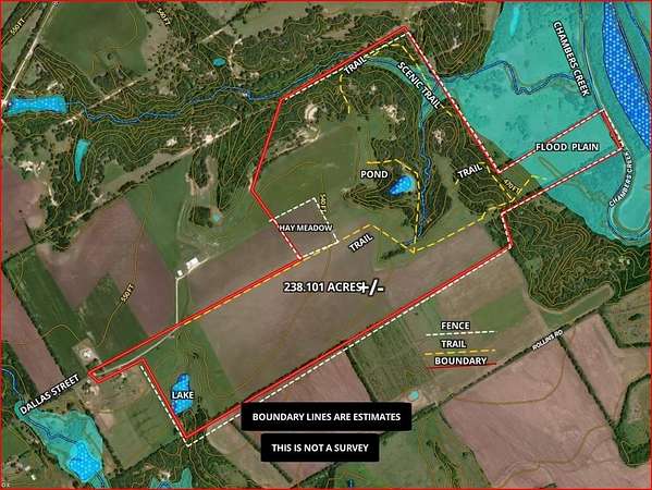 238 ACRE CATTLE AND RECREATIONAL RANCH JUST ONE HOUR SOUTH FROM DOWNTOWN DALLAS ! Large tracts such as this so close to Dallas are increasingly rare to find. Turn off the Interstate and in just a few minutes you will be in a world of peace, quiet, serenity and privacy that you could not imagine. This 238 acre property is currently being used for ranching and recreational purposes. Tucked away just off Interstate 35E the property offers extensive opportunities to add your own vision to this tract. The land is a combination of open land plus heavily wooded areas with hillsides and 90 foot elevation changes with many hardwood trees such as native pecan, oak, ash and others. Several scenic trails twist through the wooded hill sides suitable for driving, walking or riding. Rich bottom land with frontage along historic Chambers Creek. Two picturesque lakes provide fishing and plenty of water for livestock and wildlife. Whitetail DEER and Wild TURKEY occasionally inhabit the area along with smaller wildlife such as bobcat, armadillo, squirrels, racoons, coyotes, hogs and others plus bird hunting in season. Envision riding your ATV or horses through the wooded trails for hours. There is also plenty of space for your own shooting range. Some acreage is in Hybrid Bluestem for improved grazing and hay production. There are several nice building sites on the property for a home, a weekend cabin or just bring your RV. Located outside the friendly community of Italy, Texas and easily accessible by I-35E which is only 15 minutes away. The property is currently Ag exempt for low property taxes. If you do not want to raise livestock yourself a local rancher will lease it from you and you still have all the other benefits. Buyers are responsible to verify availability of utilities, building codes, schools and any other public regulations.