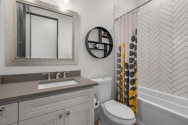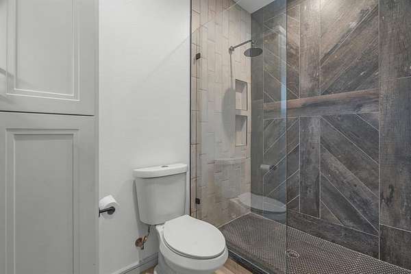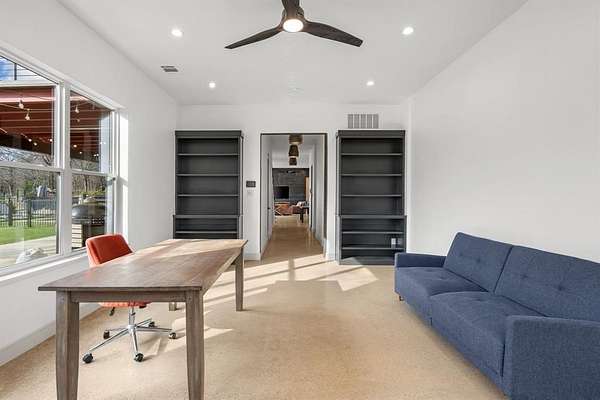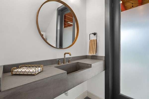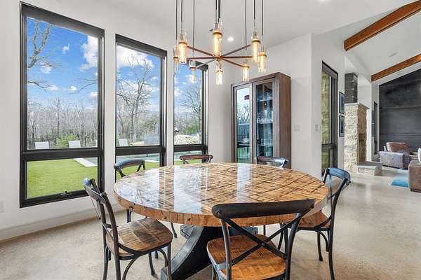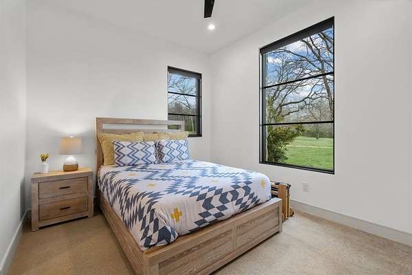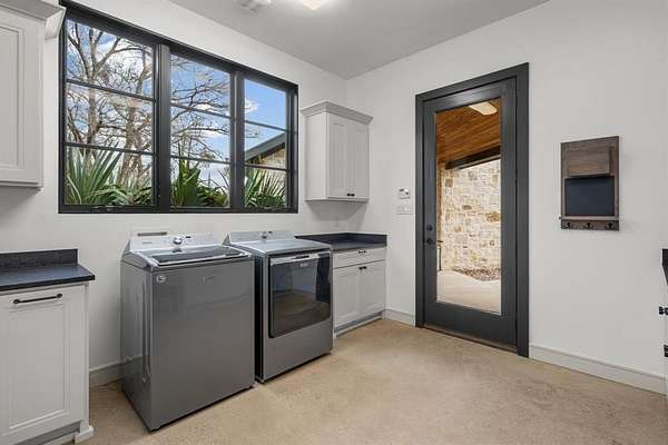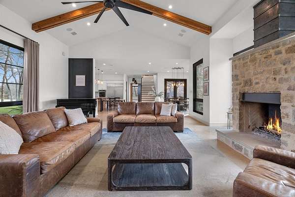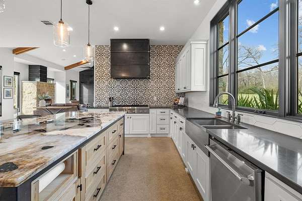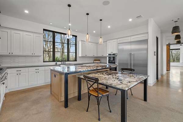 The main level offers a highly functional layout designed for everyday living and entertaining. Downstairs includes the primary suite with double walk-in closets and private stone courtyard access, an additional bedroom with full en-suite bathroom, a dedicated study, second office or flex space, open living area with stone fireplace and magnetic feature wall, dining area, and a chef’s kitchen. The kitchen features Patagonia stone countertops, custom cabinetry with pull-out storage, walk-in pantry with built-ins, and a full Thermador appliance package including a 48-inch gas cooktop, 30-inch refrigerator, 30-inch freezer, and dishwasher. Additional main level features include polished concrete floors, white oak flooring in the entry and primary suite, laundry room with mud bench and sink, leathered granite countertops in the laundry, pool bath, and a 3-car garage.