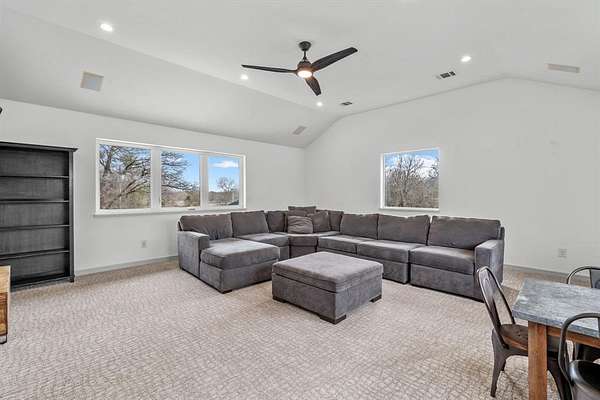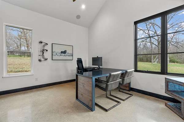 The second floor includes two bedrooms, two full bathrooms, and an additional living area, along with two second-story patios overlooking the front and back of the property, providing elevated views of the surrounding acreage.