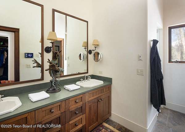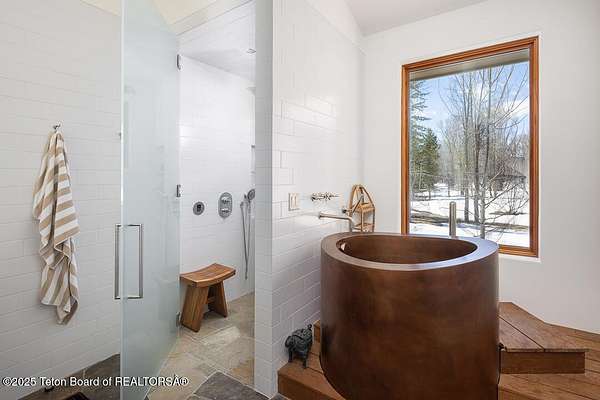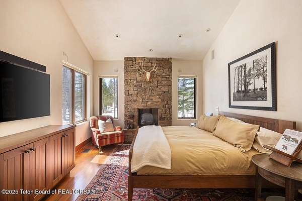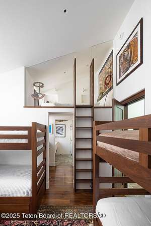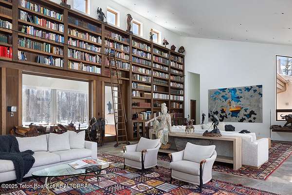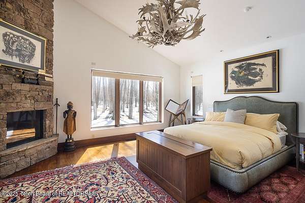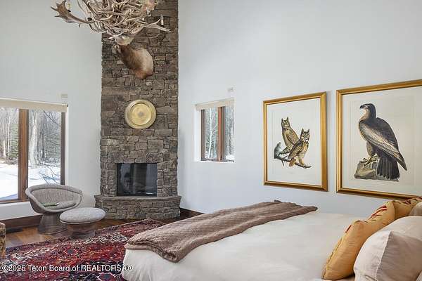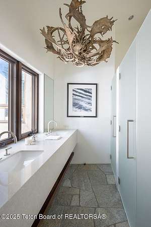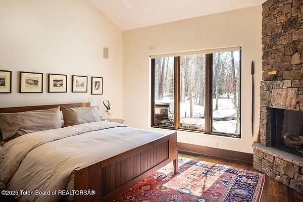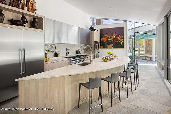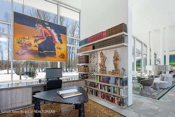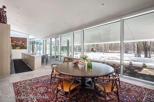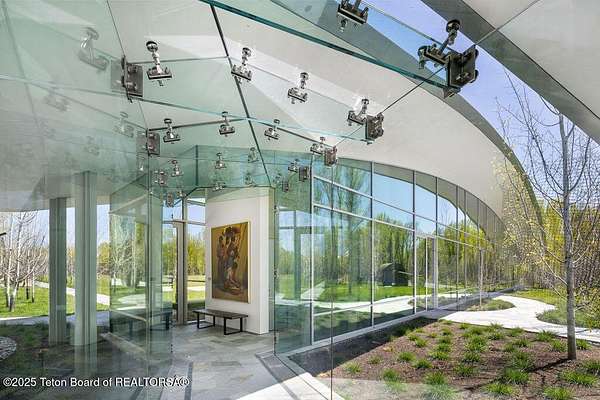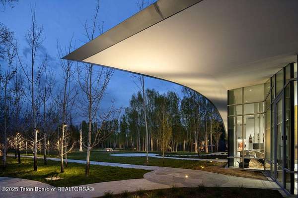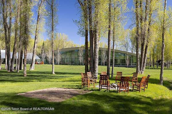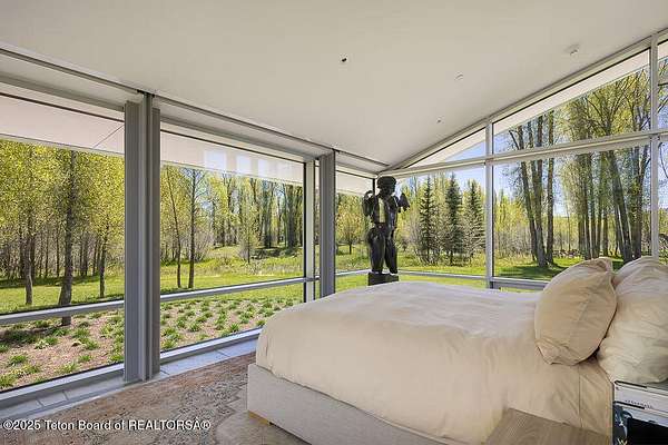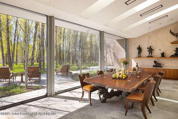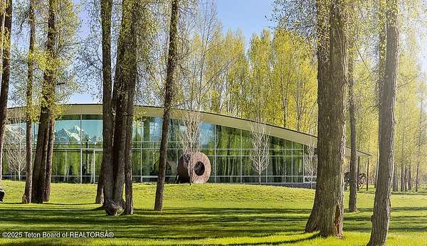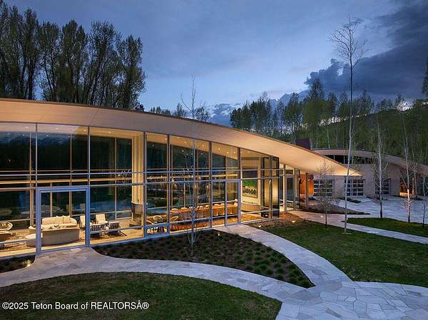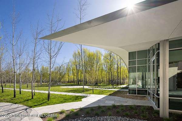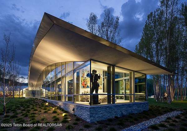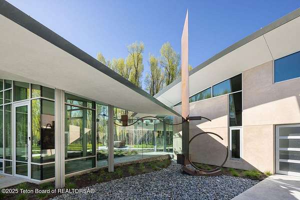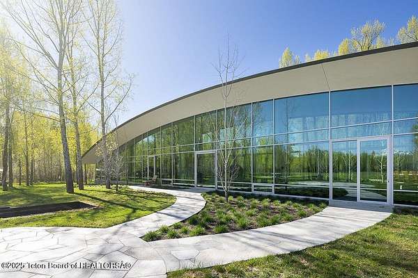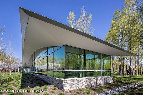 Situated on arguably the best parcel in Crescent H Ranch with expansive Teton views and prime Snake River frontage, this newly constructed project, completed in 2023 and designed by renowned architect Wallace Cunningham, is a living sculpture. Its connection to its surroundings is profound, with the natural beauty of Fish Creek, Grand Teton views, and wildlife like elk, moose, and eagles enhancing its setting. The architecture seamlessly integrates with the landscape, nestled into a stream curve, with a parallel pool reflecting both the mountains and the house. The sweeping sculptural roof and lofty interiors blur the boundaries between indoors and outdoors, creating inviting spaces for private enjoyment or entertaining. The private primary suite features large closets, a stone tub, and a walk-in stone shower with Teton views, followed by a stunning bedroom area. Five private en-suite guest rooms occupy the southern end, adjacent to the main living area, professional-grade kitchen, and glass-enclosed formal dining area at the home's center. The lower level includes an additional office, a wine storage room, and an attached three-car garage, completing the property. A glass corridor connects the two roofs, offering views of the sky, landscape, and art, creating stunning shadows. This corridor serves as a focal point, bringing the house's design ideas into clear focus. The owners were among the first to purchase property in the ranch, acquiring what is arguably the best land parcel within Crescent H. This property offers end-of-road privacy, spring creeks, Snake River frontage, and expansive views of the Teton Mountain Range. Through thoughtful planning and stewardship, they worked with Teton County and the Jackson Hole Land Trust to place a conservation easement on the property, which allows for additional development rights, including a second dwelling. Crescent H Ranch boasts miles of trails for horseback riding, cross-country skiing and hiking, as well as miles of private spring creeks, ponds and Snake River frontage for first-rate fishing. At Crescent H, homeowners owning smaller lots (a half acre to two acres) and those owning larger lots (35 to 50 acres) will all feel like they're living on 200 to 500 acres. The fishing access to an abundance of high-quality spring creek water sets Crescent H apart from other Jackson Hole neighborhoods. In fact, at one point in its history, Crescent H was one of the finest fishing camps in the country. As one expert said, "There's a lot to be said for having spring creek fishing during a high run-off year. There are a lot of times you can't fish the Snake River when you can fish the creeks." Fishing at Crescent H is for residents and their guests only. Homeowners also have access to Bridger-Teton National Forest. Crescent H's forested hills and tree-studded meadows create both a sense of privacy and a feeling of being in harmony with nature. Wildlife is abundant, but Crescent H is also a short drive from manmade attractions. The shops, restaurants and art galleries of downtown Jackson are close, as is the world-class skiing of Jackson Hole Mountain Resort. A historic Western lodge on-site at Crescent H serves as a reminder of the property's heritage.