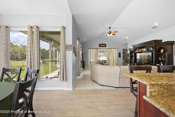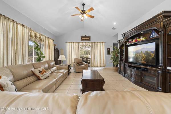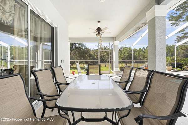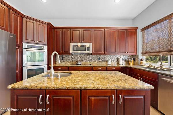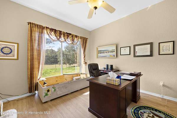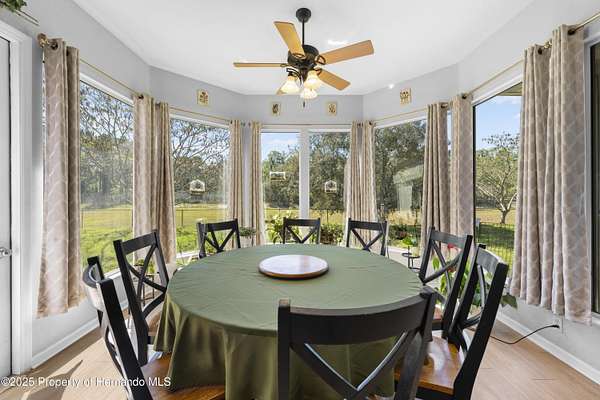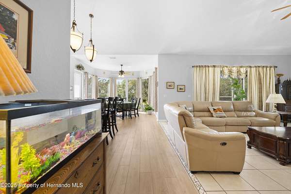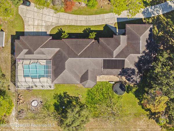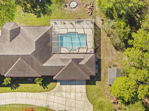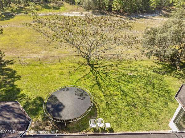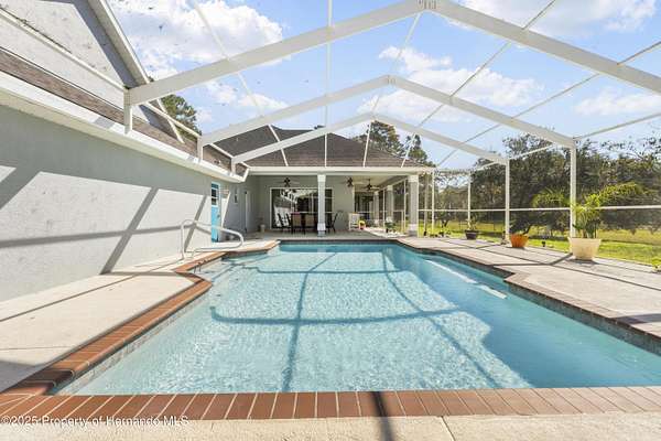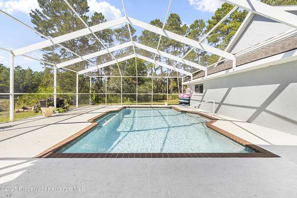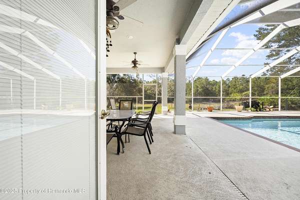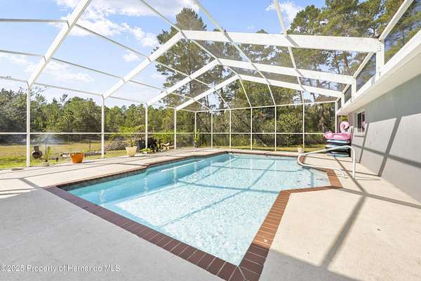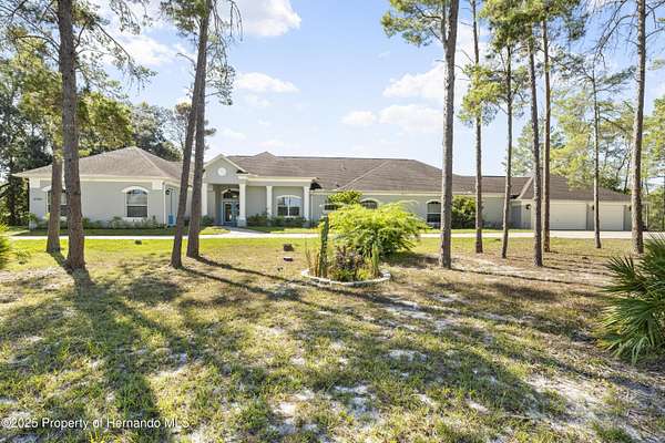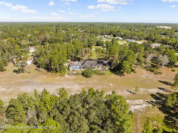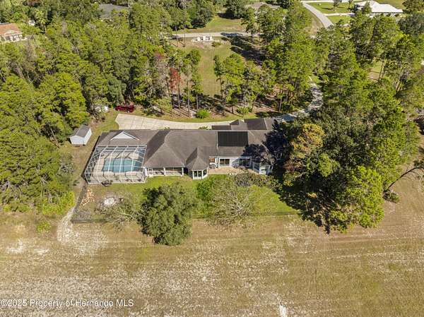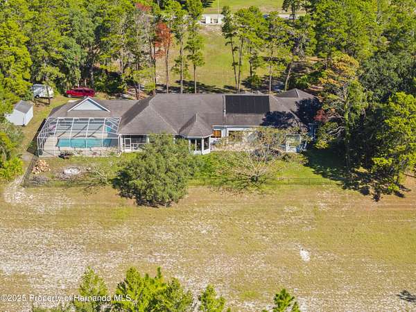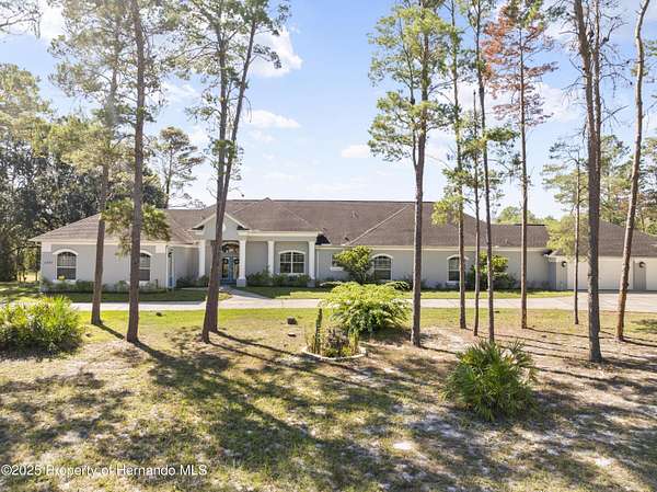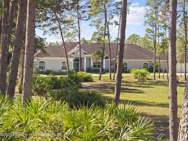 This magnificent estate offers a rare opportunity to own a home with 4,409 square feet of living space on more than 4 acres, complemented by the low HOA fees of the sought-after Woodland Waters community. With 6 bedrooms, 3.5 baths, and a 3-car garage (one air-conditioned), the residence provides a sprawling, flexible floor plan that includes a large great room and an additional family room for entertaining. The gourmet island kitchen is a culinary enthusiast's dream, featuring a bar sink, a breakfast bar, and quality stainless steel appliances like dual wall ovens, while large windows in the dining area offer serene, full-glass views of the expansive property. Modern and energy-efficient systems are in place, with two newer A/C units (2022 and 2020) and two water heaters. The outdoor living space is equally impressive, with a huge, screened-in, solar-heated pool with a newer Diamond Brite finish, a 4-person hot tub on the screened back porch, and a chain-link fenced area ideal for pets or children to play. Home is on Hernando County Water but sprinkler system is on an Irrigation Well. A long, double-wide driveway provides abundant parking for an RV or large trailers, and the property is conveniently located just a few miles from the Weeki Wachee Mermaid Attraction, beautiful beaches, and a wide array of shopping, dining, and medical facilities.