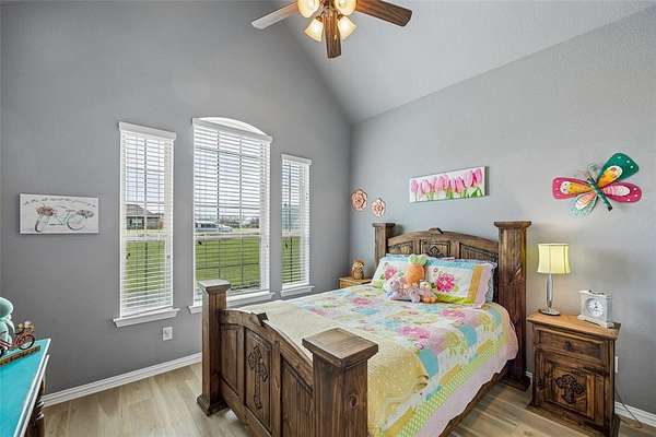 The gourmet kitchen is a true centerpiece of the home, featuring rich granite countertops, a large island, abundant cabinet and counter space, and an oversized walk-in pantry. It opens seamlessly to the living room, where vaulted ceilings and expansive windows showcase stunning views of the backyard and pool.