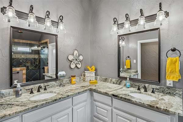 The primary suite also features beautiful granite countertops and stylish finishes, creating a relaxing retreat. Step outside to your own backyard oasis where a huge covered patio overlooks the sparkling pool and lush landscape. The outdoor kitchen and fireplace make it the perfect setting for gatherings, summer evenings, or simply enjoying the peaceful surroundings.