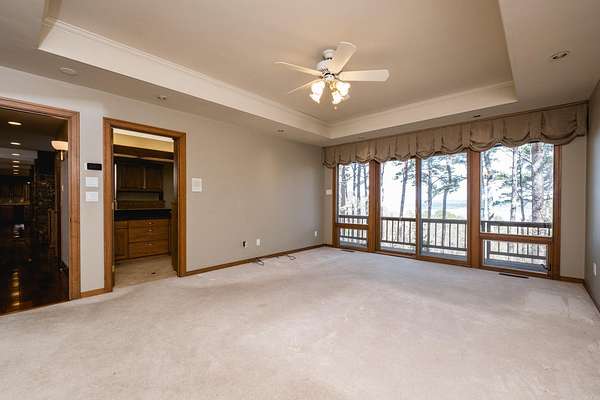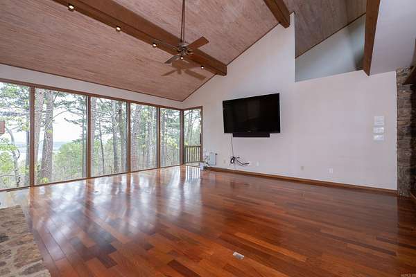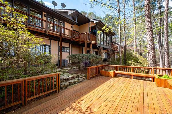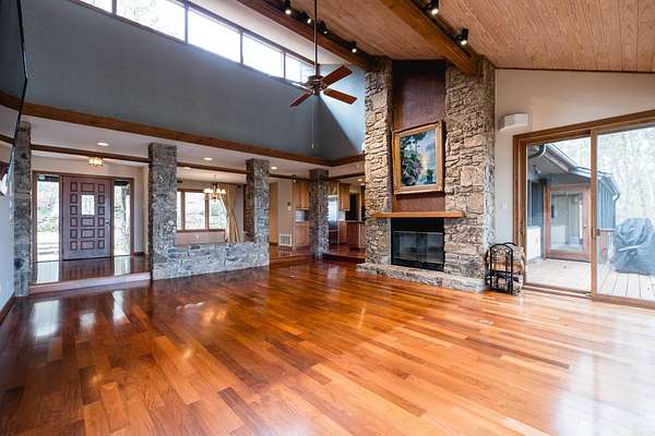 Private drive off a gated road leads to this home tucked among the trees with beautiful lake and mountain views and so much more. Vaulted great room with wood burning fireplace and walls of windows opens to multiple decks for easy indoor and outdoor living. Kitchen features granite countertops, island, and both formal and informal dining areas. Main level includes guest bedroom and hall bath along with a spacious primary suite offering a large walk-in closet and ensuite bath with dual sink vanity, soaking tub, and separate shower as well as deck leading to outdoor hot tub. Laundry room with sink and abundant cabinetry plus an all-weather sunroom connecting to the guest house. Downstairs includes two additional bedrooms with exterior access, a full bath, workshop area, under house storage and climate controlled garage. Separate guest house of approx. 898 SF, 1 bedroom, 1 bath, included in total square footage, features kitchen, laundry and large living area with fireplace and wall of windows overlooking the woods, ideal for guests or extended living. Two carports complete the setting. Come see!