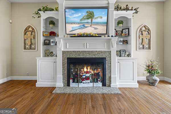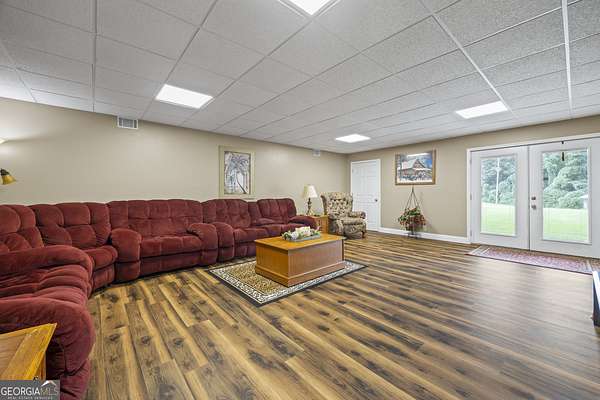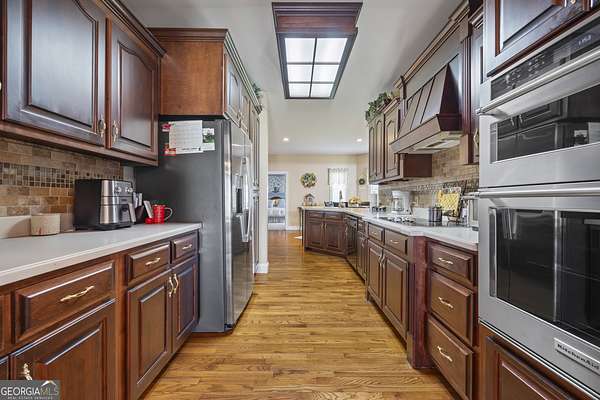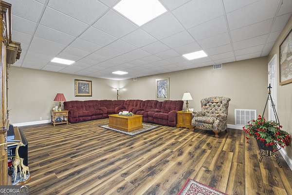 Welcome to this stately, custom-designed brick residence offering over 6,000 square feet of refined living space. Situated on 5 beautifully maintained acres, this property offers privacy, space, and versatility. Step into a beautiful great room featuring a cozy fireplace and custom built-ins-ideal for both entertaining and everyday comfort. The expansive layout is perfectly suited for multi-generational living, with rich hardwood floors that elevate the home's warmth and charm. The kitchen has Corian countertops, with appliances that include a built-in cooktop, wall oven, microwave, and dishwasher, plus a generous breakfast bar and sunny dining nook. Enjoy a thoughtfully designed split floor plan, placing the luxurious primary suite in its own wing. The ensuite bath is a true retreat, complete with dual vanities, a spa-style jetted tub, and a separate walk-in shower. The main level includes a large laundry room right off the kitchen. The finished basement offers flexibility with a private bedroom and bath, a dedicated living room, plus a second lower-level garage making it ideal for guests or a rental opportunity. Parking and storage abound with an oversized two-car garage on the main level and the lower-level garage that can easily accommodate multiple vehicles. An additional bonus: outdoors, there is a screened porch overlooking a garden area along with a detached garage/carport and shed. This home has so many great things to offer. Don't miss the chance to make it yours!