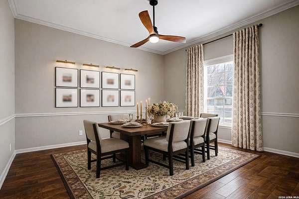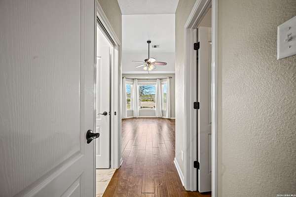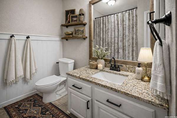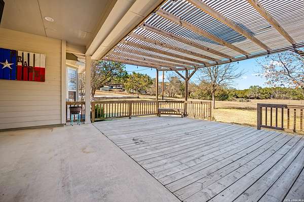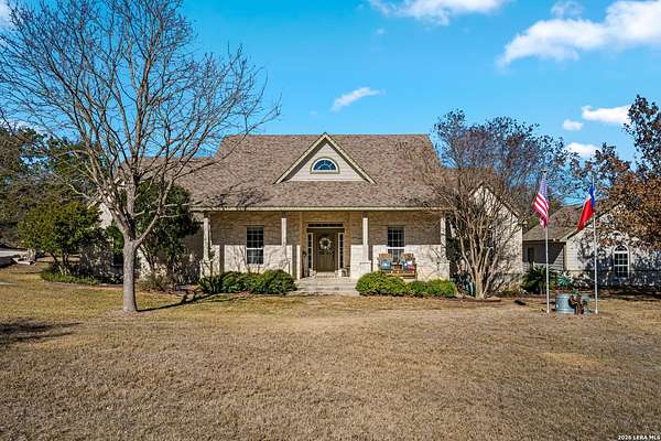 Situated on 5 private, fully fenced and cross-fenced acres in the Texas Hill Country, this 3 bedroom, 3 bath residence offers 2,506 sq ft of well-designed living space, with all rooms thoughtfully arranged on one level for convenience and functionality. The home includes a dedicated office, providing versatile space for work or study. The living area is anchored by a stone/rock wood-burning fireplace, while the kitchen features custom cabinetry, an island, breakfast bar, eat-in dining, and ample storage-ideal for everyday living and entertaining. The primary suite boasts his-and-hers closets and a fully renovated en-suite bath completed in September 2025, with double vanities and a walk-in shower. Recent updates include fresh paint on interior trim, doors, and baseboards, and nighttime uplighting on the exterior enhances the home and mature trees, creating a warm and inviting evening atmosphere. A rare and exceptional highlight of the property is the 2,400 sq ft fully wired workshop with 110v and 220v electrical, propane heat, and a truck lift-perfect for anyone needing substantial workspace. Additional improvements include a detached garage, a carport, circular drive, RV hookup, and a barn. Outdoor amenities complement the Hill Country lifestyle, with a covered patio, rear deck, horse-friendly acreage, and paved county road frontage. Combining unparalleled privacy, endless versatility, and a show stopping custom workshop, this property is a rare Hill Country gem just minutes from the best of Spring Branch living and amenities.