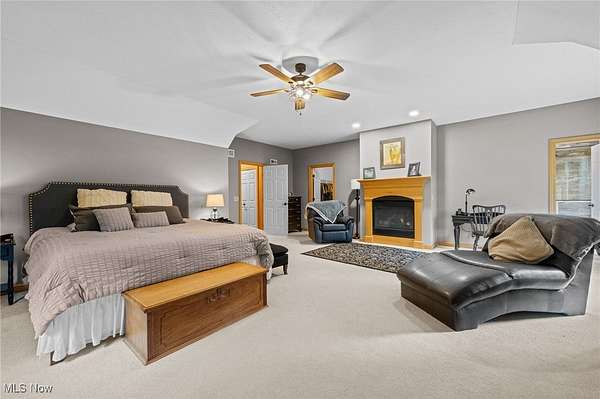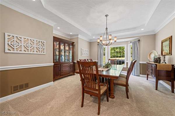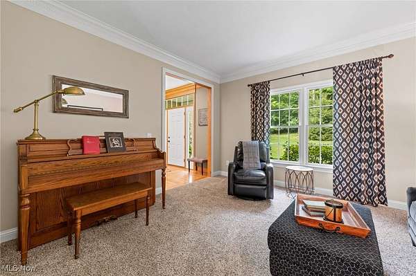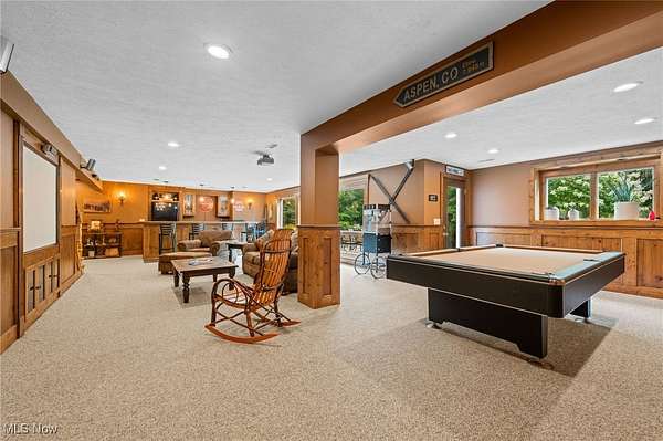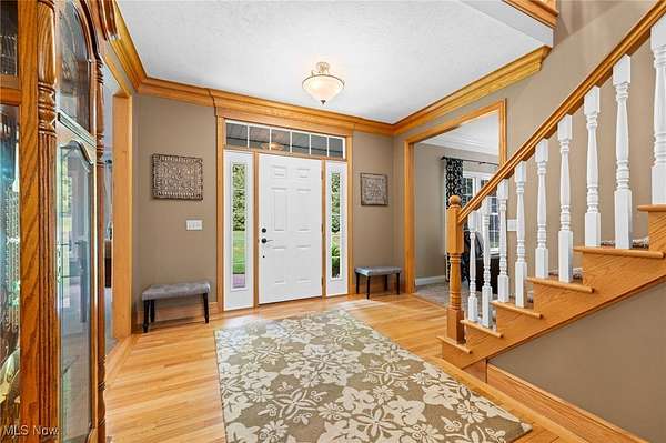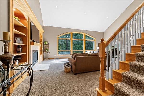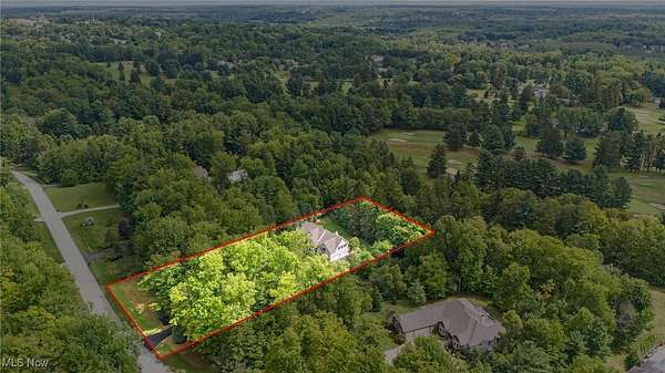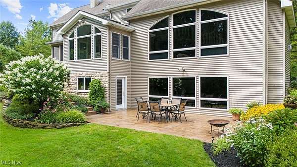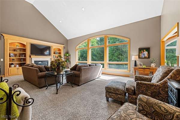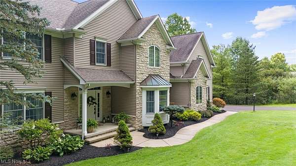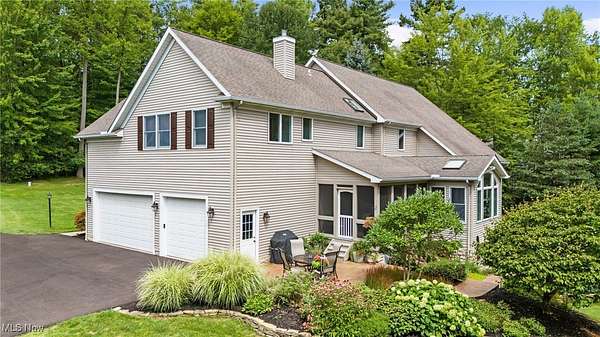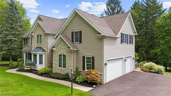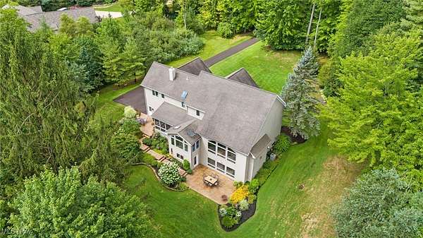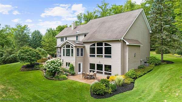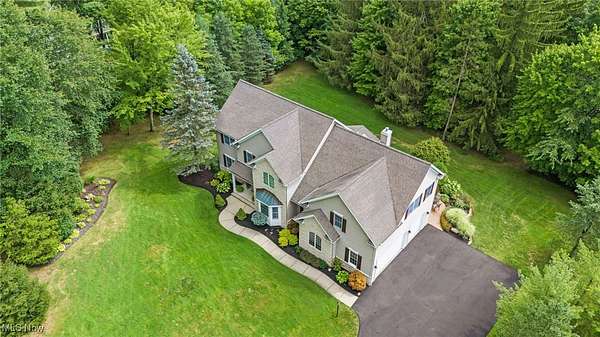 INCREDIBLE Custom Built Home situated on 2.5+ Private Wooded Acres and borders Chardon Lakes Golf Course! Builders personal home was thoughtfully designed and quality-built with over 5800 sqft of finished living space, gorgeous woodwork and tasteful neutral decor throughout! The covered front entry and foyer welcomes you with hardwood floors and opens to both Spacious Formal Dining Room and Living Room. Vaulted Great Room with wall of windows, gas fireplace flanked by built-in bookshelves/cabinetry and 2nd staircase to upper level. The Gourmet Kitchen is beautifully appointed with abundance of cabinets, granite counters, breakfast bar, newer stainless steel appliances, built-in desk, pantry and hardwood floors. Bright & light Breakfast Room with vaulted beamed ceiling & sliders to 3-Season Sunroom to enjoy peaceful views with your morning coffee. Retreat to the Master Bedroom Suite with fireplace, walk-in closet & Remodeled Master Bath with tongue & groove wood ceiling, double sink granite vanity, oversized ceramic spa shower & freestanding soaking tub. Second floor also includes 3 additional generous sized bedrooms with great closet space & full bath to share. 1st floor laundry room, mudroom and half bath complete the main level. Finished walk-out lower level is made for entertaining with a large Rec Room and bar, with wall of windows and patio access, built-in media center, gaming area, bath, separate office and walk-up garage access. New high-efficiency furnace 2025 & HWT 2024. Relax or host on the multiple stamped concrete patios overlooking the beautifully landscaped yard with manicured beds, lush plantings & surrounded by mature trees for added privacy. 3+car attached garage with freshly paved driveway. Meticulously maintained inside & out...must see to appreciate all this home has to offer!
