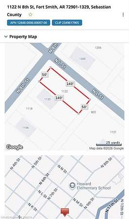 Est $166/moPrime opportunity in the heart of Fort Smith! This 0.16-acre corner lot at L Street and North 8th Street offers a fantastic central location just steps from Community Garden, Howard Elementary, Martin Luther King Park. With excellent visibility and easy access, this property is ideal for building your dream home or investment property. Enjoy the convenience of being in the middle of town while still having a charming neighborhood feel. Don't miss your chance to secure this perfectly positioned lot!
