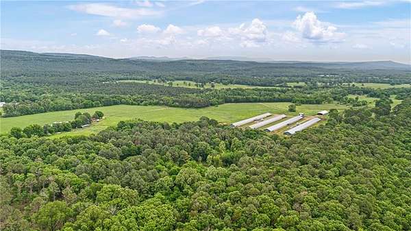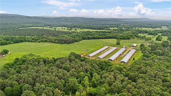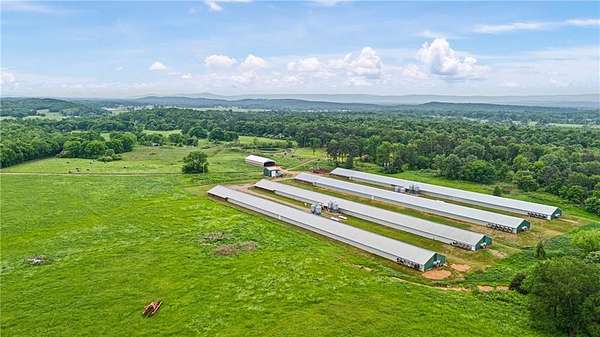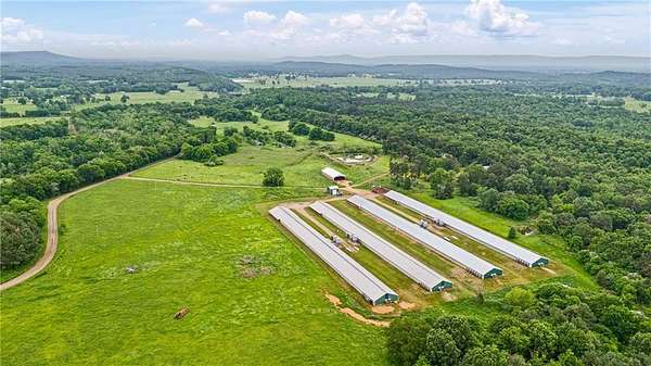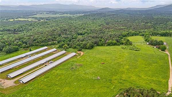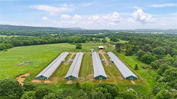 This fully operational poultry farm offers exceptional income potential and scenic beauty. Featuring (4) 43'x500' broiler houses with Choretime controls, waterers, and feed lines, this farm is designed for efficiency and ease of operation. Additional improvements include a 40'x105' litter shed, 30'x20' water room with (4) 5,100-gallon water tanks, two Deutz generators, and (4) 1,000-gallon propane tanks ensuring seamless production. Stocked pond for fishing. The surrounding lush hay meadows planted in rye and mixed grasses add value and versatility to the property. Enjoy breathtaking views of Mt. Magazine while benefiting from an average annual income of approximately $250,000.
