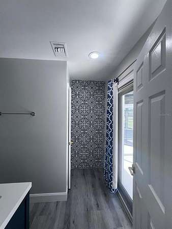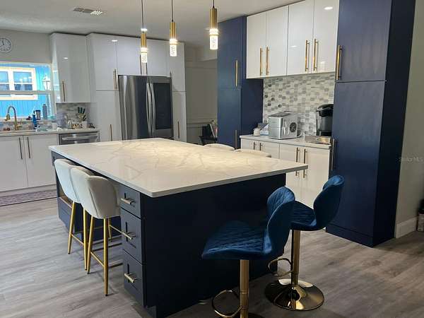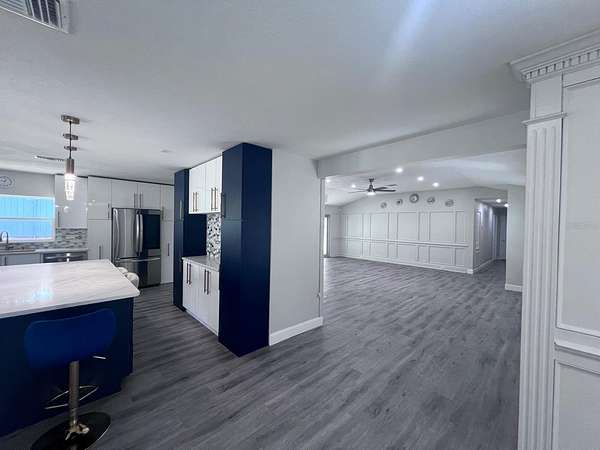 The main house features a remodeled kitchen with quartz countertops, 3 bedrooms, and 3 full bathrooms (including a convenient pool bath). Enjoy the oversized family room with a cozy fireplace, perfect for gatherings. Step outside to your screened-in pool area, ideal for memorable family days, volleyball games, or simply relaxing in the Florida sunshine. The front yard is partially fenced with wood accents, and there's ample parking for guests and family.