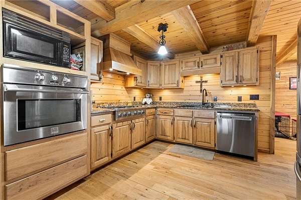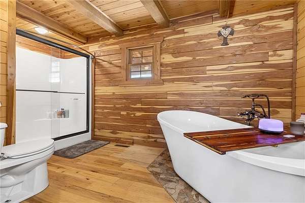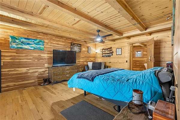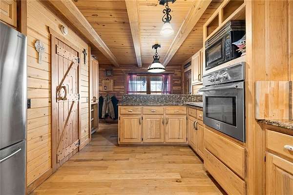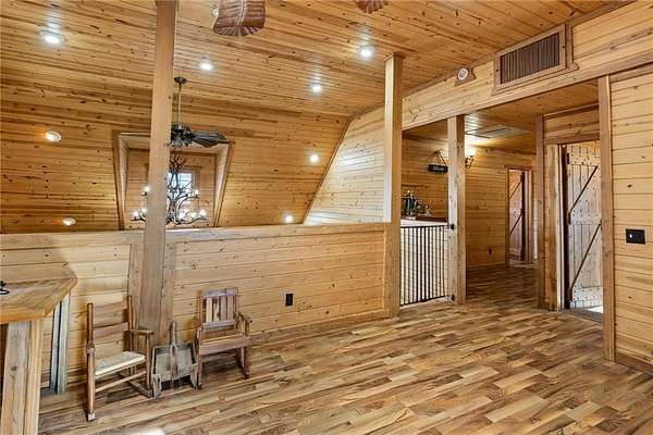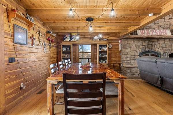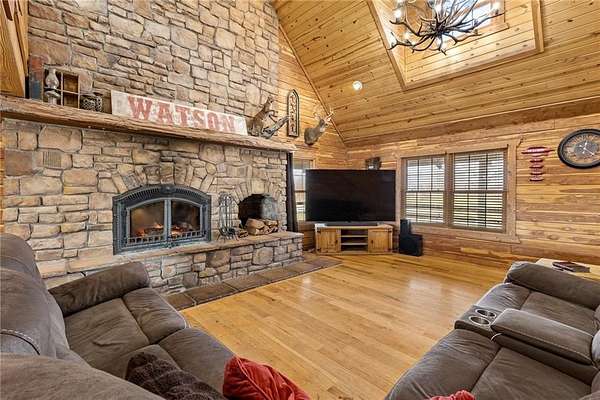 Tucked away on 26 m/l acres, this secluded log-cabin-style estate offers the perfect blend of rustic charm and modern comfort. Featuring 5 bedrooms and 3.5 bathrooms, the home is designed to capture 360-degree panoramic views, allowing you to enjoy both stunning sunrises and unforgettable sunsets from the wrap-around covered porch.