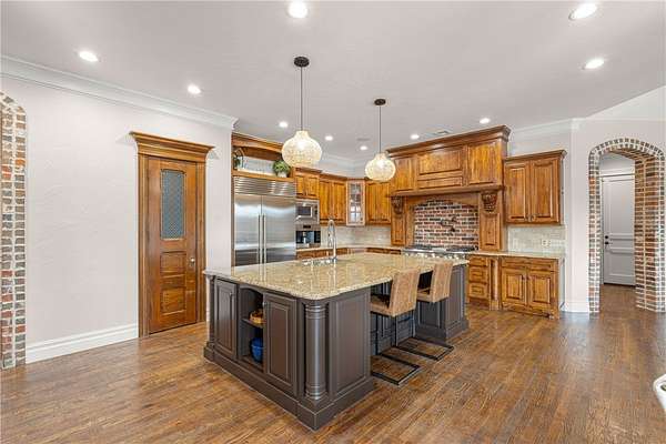 Impeccable Talamore Estate Home on 2.02 Ac w/5 Car Garage & Saltwater Pool. Your 6,479 SF Home feat. new paint throughout, hand scraped wood floors & custom upgrades. Grand entry welcomes you w/beautiful formal dining space to left & formal sitting room ahead. The living area is spacious and open w/beautiful views to your private oasis outside. Kitchen boasts 6 burner gas stove w/double oven, SubZero Fridge, built in espresso maker, wine fridge & much more! Living room has vaulted ceilings w/wood beams and beautiful stone fireplace. Main level has guest bed w/ensuite. Primary suite is spacious w/spa worthy bath feat. Tub, walk through shower, separate vanities & custom WIC. Upstairs is the study w/built ins & fireplace. 2 guest beds each w/ensuite & WIC. Billiards room, Home Theatre w/Wet bar & bonus room. Heated 4 Garage w/climate-controlled storage room. 5th Garage home gym w/access to pool & half bath. Private wooded setting for your expansive pool & patio. Contact agent for full list of upgrades & floorplan.