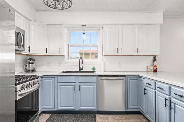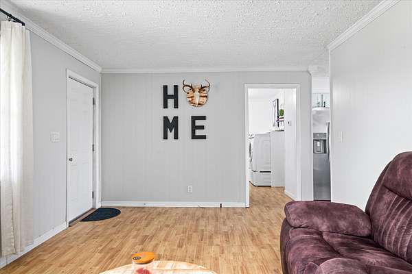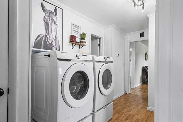 Recent updates include new laminate flooring, updated bathrooms, updated kitchen with all appliances two years old, new light fixtures, fresh paint, and a new gas water heater was installed in June 2022. Acreage has been surveyed. Dual hook up for dryer, so choice of gas or electric.