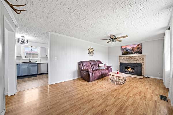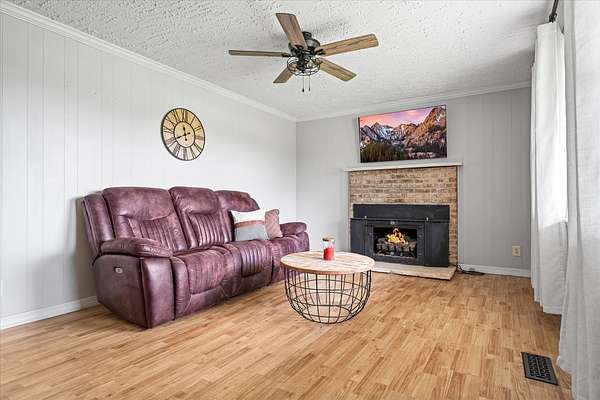 This well-maintained, all-brick ranch-style residence is situated on 2.20 acres of land, offering a spacious living room featuring a gas fireplace and a roomy kitchen equipped with stainless steel appliances approximately two years old, accompanied by a breakfast bar and an eat-in area. The interior of the home boasts lovely laminate wood flooring, three bedrooms and updated bathrooms. The primary bedroom offers a roomy walk-in closet. The exterior showcases an oversized 27 x 28 two-car garage, a covered front porch, and a covered back patio, offering pretty farmland views from both porches plus two large storage buildings, one with electric, provide you with plenty of storage space. This surveyed acreage is unrestricted, allowing you to bring any and all of your animals and provides lots of room for gardening. Ideally situated just 5 minutes from the local elementary school, 10 minutes from the City of Crossville and 35 minutes from the City of Cookeville. Make your appointment soon!