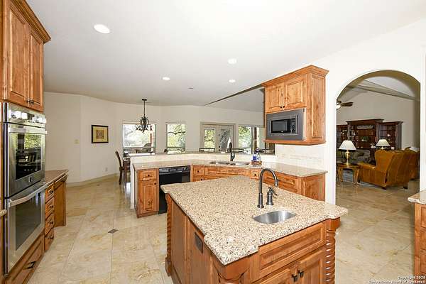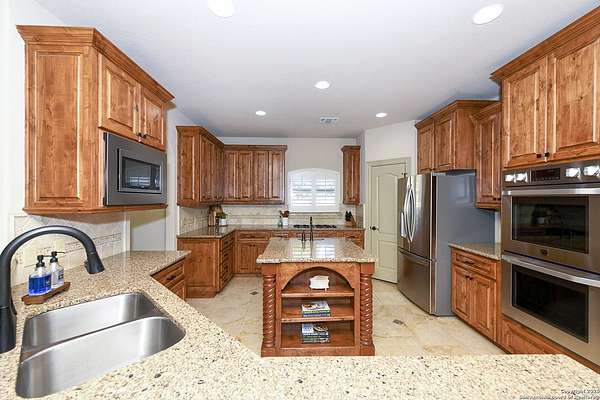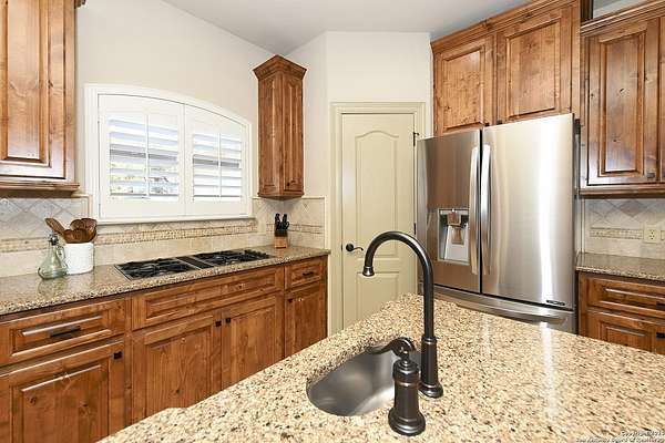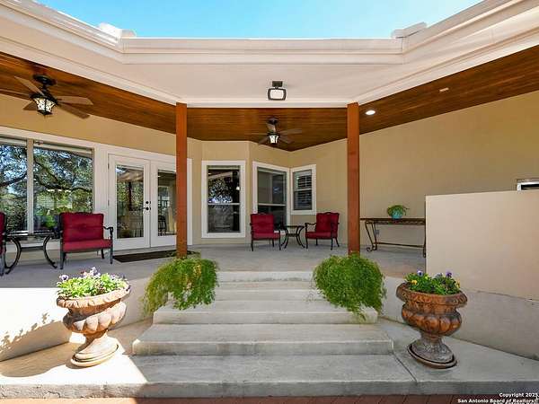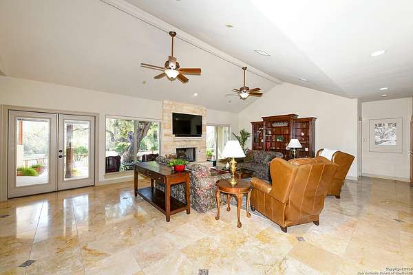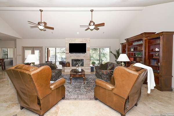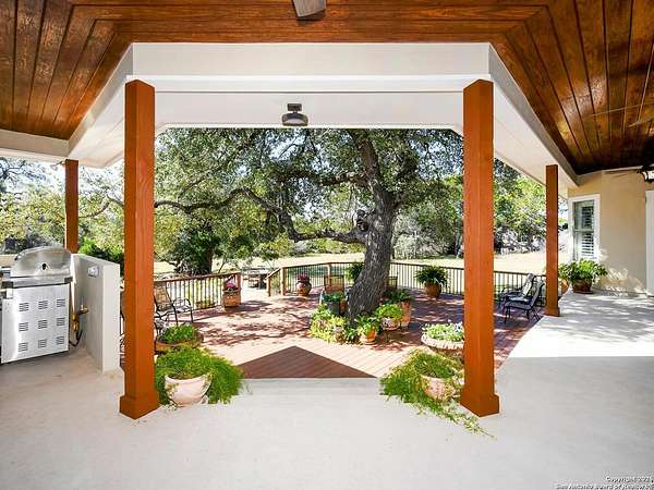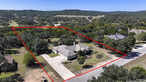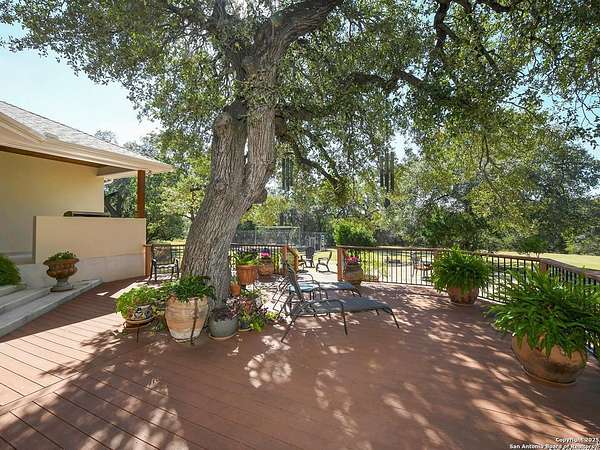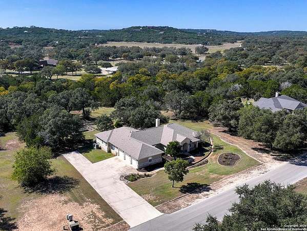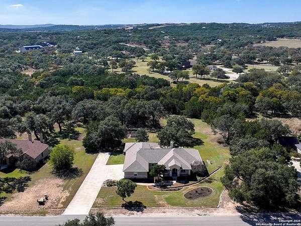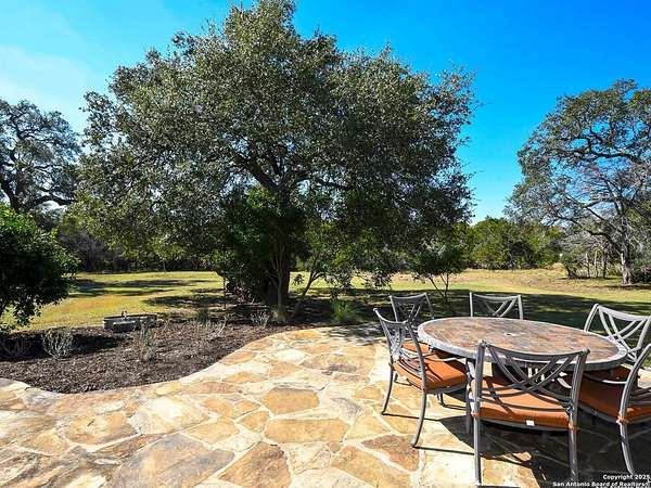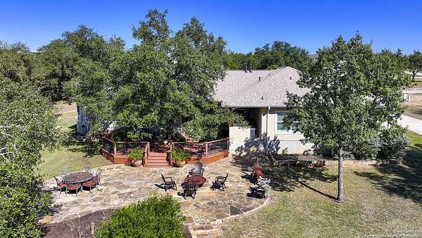 Rare opportunity for Hill Country living on 2.67 acres in The Heights at Comal Trace! Homes in this section rarely come on the market, making this a unique chance to own a custom single-story home in one of Comal County's most desirable locations. Nestled at the back of the community, the property offers exceptional privacy while keeping you close to shopping and dining. Surrounded by mature oaks and a wooded greenbelt, the setting feels like a Hill Country retreat with abundant wildlife including deer and turkey. The open-concept layout features 4 bedrooms plus an office, 3.5 baths, and abundant natural light. The chef's kitchen is a true centerpiece with an oversized island, gas cooktop, double ovens, and walk-in pantry, flowing into a spacious living area with Austin stone accents and a wood-burning fireplace with gas starter. Elegant finishes include polished travertine tile, plantation shutters, and large windows framing serene views. The primary suite offers porch access and a spa-inspired bath with jetted tub, walk-in shower, and dual walk-in closets. Secondary bedrooms provide generous storage, including two walk-ins, and one features bamboo flooring ideal for a craft or art space. The laundry room includes a utility sink, built-in ironing board, space for an extra refrigerator or freezer, and a walk-in storage closet. Outdoor living shines with a covered porch, composite deck, oversized flagstone patio, and a large deer-proof fenced garden with raised beds and timed irrigation. The whimsical flagstone drainage feature adds charm. The 3-car garage includes a workbench, and the extended, widened driveway offers extra parking and RV-friendly features including a 30-amp outlet for convenient trip preparation. Plenty of room to add a pool, RV garage, or casita (subject to ACC approval). This property blends Hill Country charm with modern convenience-a rare find in Comal County!