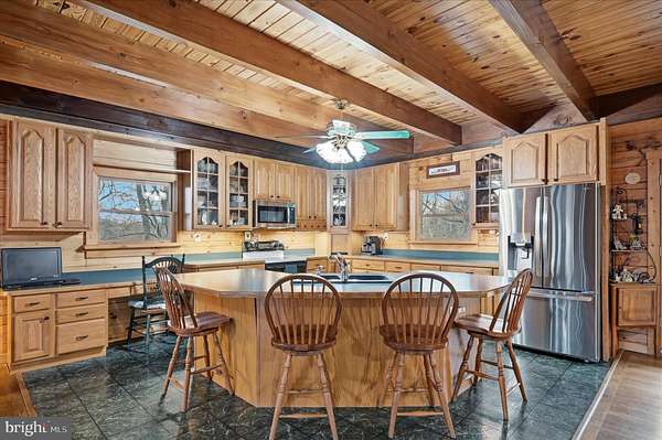 - Ceiling Fan(s), Combination Kitchen/Dining, Country Kitchen, Dining Area, Entry Level Bedroom, Exposed Beams, Family Room Off Kitchen, Island Kitchen, Jetted Tub Bathroom, Open Floor Plan, Pantry, Primary Bath(s), Tub Shower Bathroom, Walk-In Closet(s), Wet/Dry Bar, Window Treatments, Wood Floors