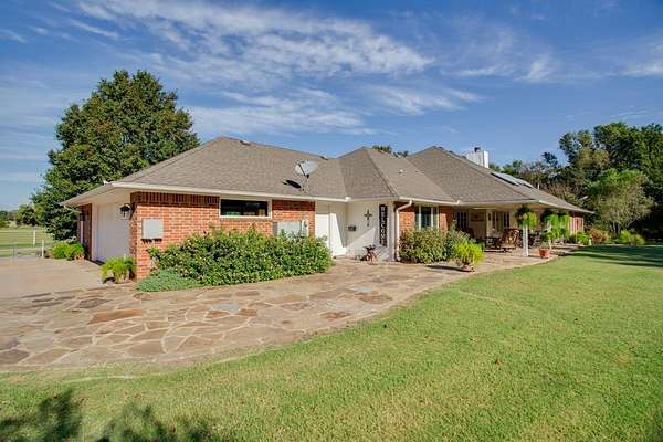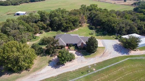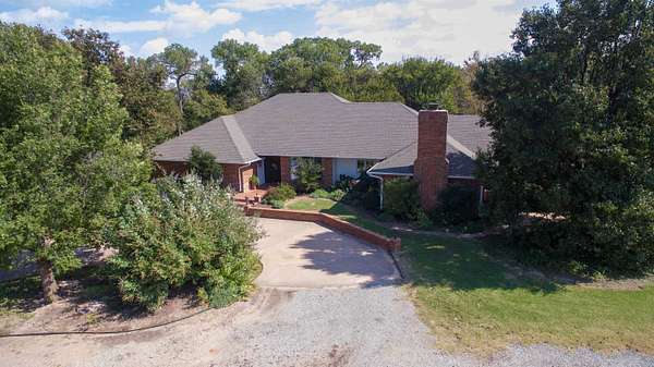 Enjoy peaceful, tranquil country living with this spacious ranch-style home situated on 34+- acres just 5 miles north of Enid. The home offers 4 bedrooms, 3 bathrooms, 2 living areas, a formal dining room, breakfast nook, and extra storage in the garage, providing plenty of space for comfortable living. Step outside to the flagstone patio and take in views of the mature tree line--a perfect spot to watch deer and turkey pass by. Inside, the home features beautiful hardwood and slate flooring throughout. The chef's kitchen is equipped with double ovens, a warming drawer, large island, wood-paneled refrigerator, built-in ice maker, and stunning granite countertops. The family room is ideal for entertaining, showcasing a cathedral ceiling, wood-burning fireplace, custom built-ins, and enough space for a pool table. The 34 acres (MOL) include some of the most well-maintained land in the area, featuring multiple Bermuda hay meadows, and mature trees. A 30x60 shop with a 24x60 carport offers concrete flooring, two automatic doors, and ample equipment storage. Truly a one-of-a-kind property--rural serenity located just minutes from Enid, you'll appreciate the convenience of town nearby while still enjoying the space and freedom of wide-open land.