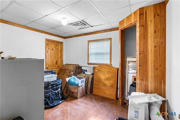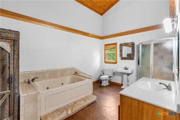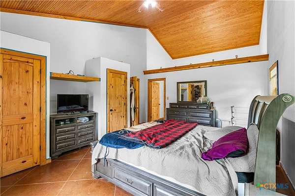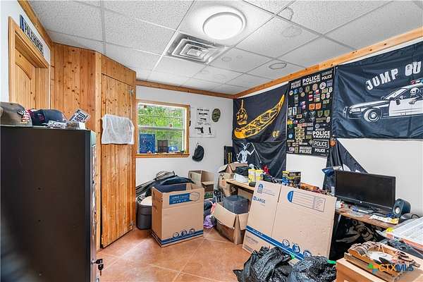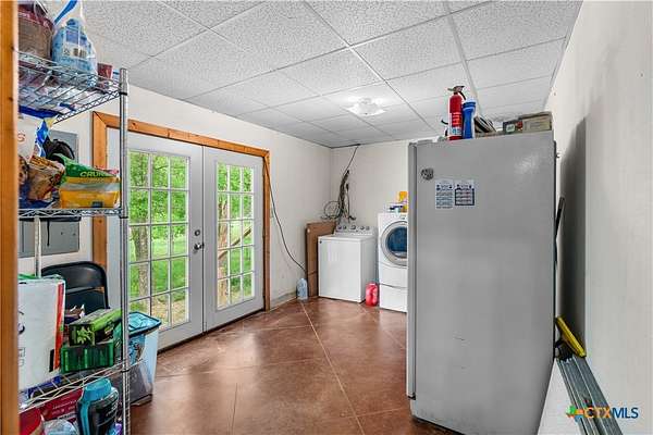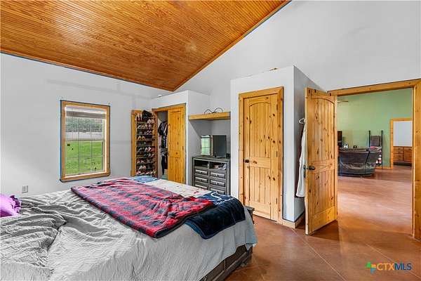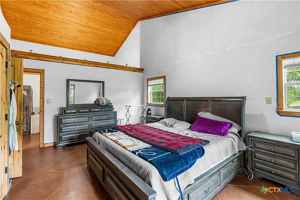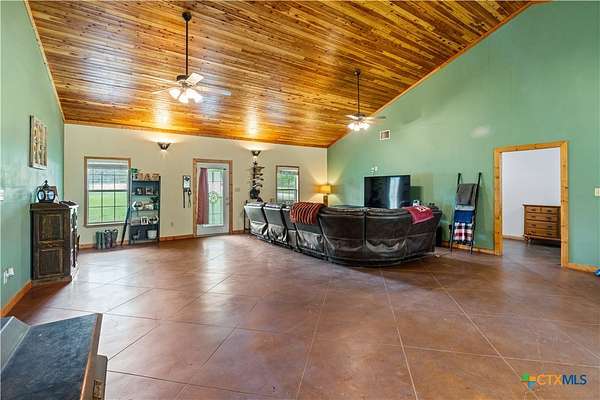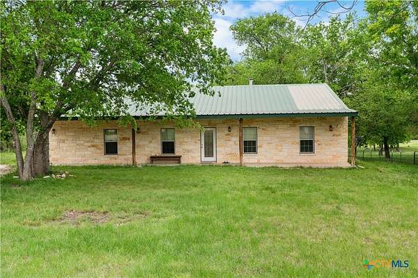 Enjoy peaceful country living on 14.7 beautiful acres with this spacious 5-bedroom, 3-bath Austin stone ranch. The heart of the home features a large open-concept living, dining, and kitchen area with soaring vaulted wood ceilings and a cozy wood-burning stove. Stained concrete floors run throughout, offering both durability and style. The kitchen is equipped with warm pine cabinetry, a large island, and a dining space that easily accommodates an oversized table-perfect for gatherings. Two sets of French doors lead from the dining area and utility room to a full-length back deck, ideal for enjoying the scenic surroundings. The split floor plan provides privacy, with four bedrooms, a flex room, and two bathrooms on one side, while the spacious primary suite features vaulted ceilings, dual closets, and an ensuite bath with separate vanities, a walk-in shower, and a relaxing garden tub. Mature trees create a shaded yard, while the back of the property is heavily wooded for added privacy. A stock tank sits near the center of the property, along with a seasonal tank that has been used as a shooting range during low water levels. Additional improvements include a 25x50 workshop with extra concrete workspace and a full bathroom with its own septic system, as well as a 20x20 barn with a carport on one side and two stalls on the other. The property is serviced by a well, with co-op water available at the property line. This versatile property offers space, functionality, and the perfect blend of comfort and country charm.