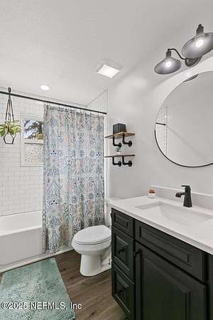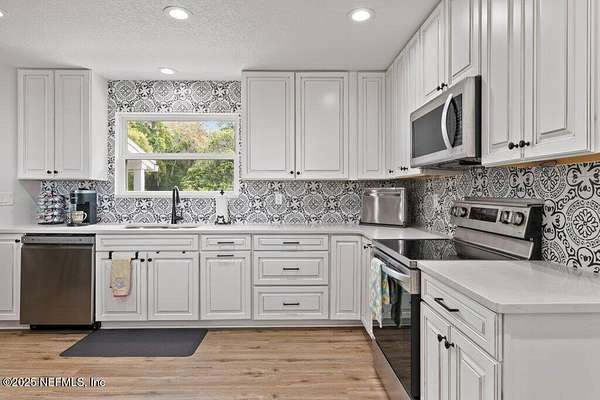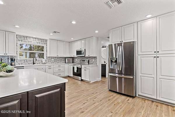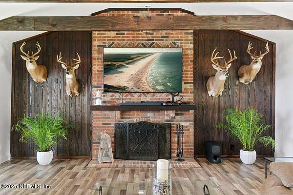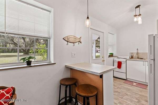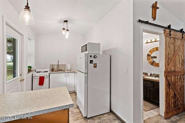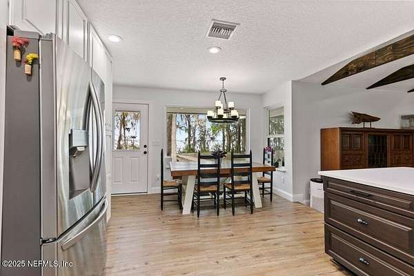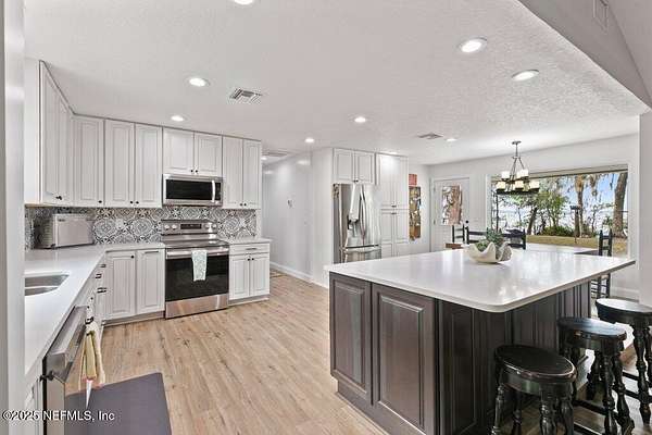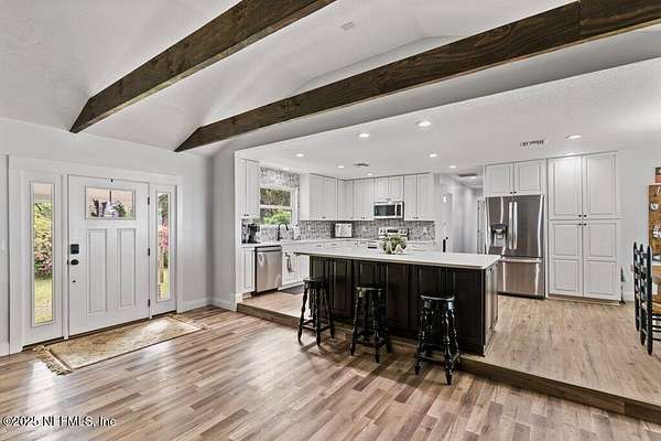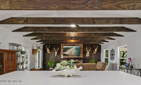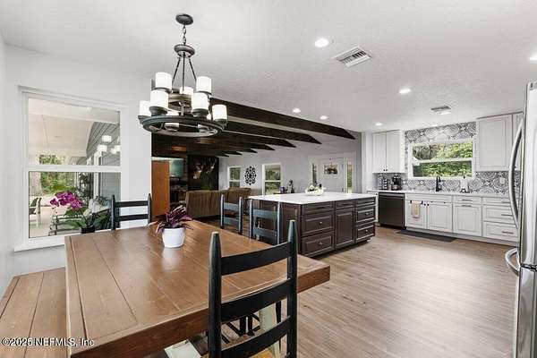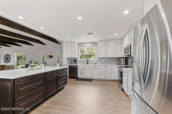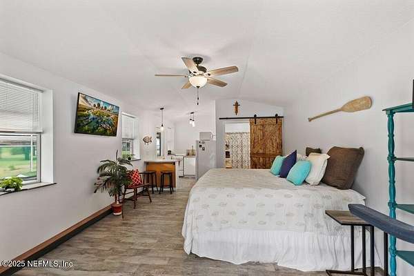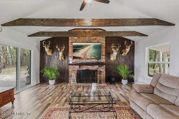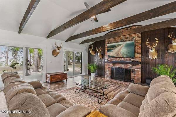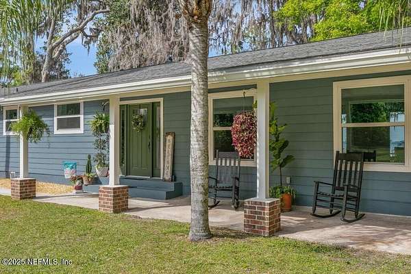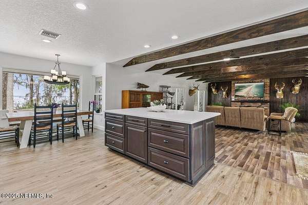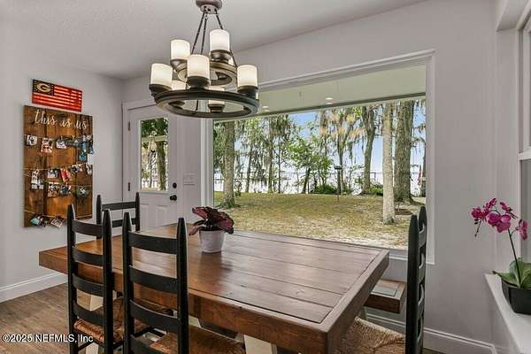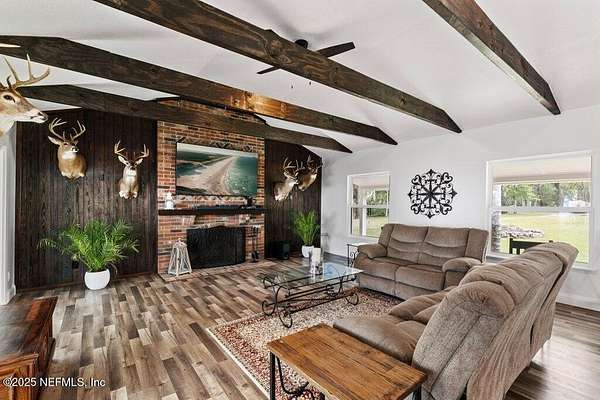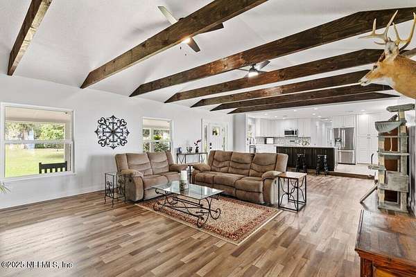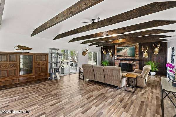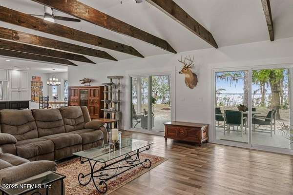 Step inside to an expansive open floor plan, where high ceilings & beautiful wooden trusses immediately capture your attention. Picture windows and sliding glass doors frame stunning water views, offering a seamless connection between the indoors and the natural beauty outside. Enjoy your morning coffee on the back porch while overlooking the tranquil water Every inch of this home has been thoughtfully redesigned and remodeled, making it feel like a brand-new build. Luxury vinyl floors flow effortlessly throughout the home, and both the main bath and primary suite have been completely updated to offer modern comfort and elegance.