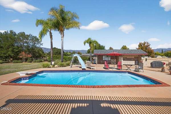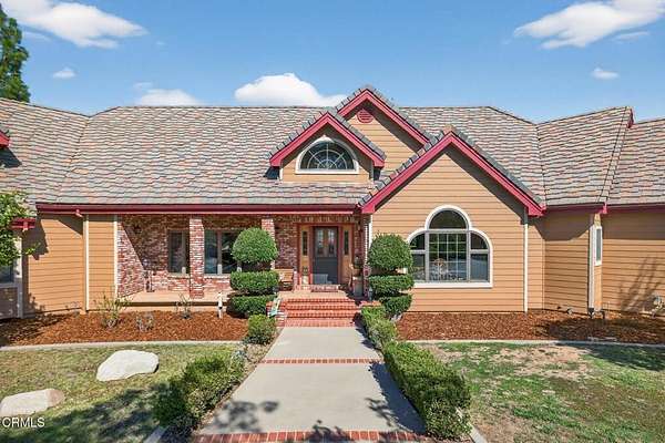 Welcome to 1125 Spring Street, an exceptional custom-built estate situated within the highly sought-after Olivas Mesa Private Community enclave of just 10 distinguished homes. Offered for the first time by the original owner and builder, this property radiates true craftsmanship, meticulous care, and timeless design inside and out.Set on 2.08 flat, fully usable acres with 60+ tangerine trees, this single-level, nearly 4,000 sq. ft. residence combines refined country living with modern luxury. A grand circular driveway introduces the home, surrounded by lush landscaping, palm trees, and views of the majestic Ojai Valley and surrounding mountains.Inside, the formal entry leads to expansive living spaces highlighted by vaulted ceilings, a raised-hearth gas fireplace, and panoramic views. The entertainer's kitchen is designed for gatherings--featuring a large center island, custom cabinetry, breakfast and dinner area in kitchen along with a separate formal dining room. Additional spaces include a front den/study/piano room, second floor bonus/game room or guest suite, and a large laundry and utility room.The spacious primary suite comes with a large with a walk-in closet, walk-in shower stall, a separate oversized soaking tub and a private deck overlooking the Ojai valley--the perfect place to unwind and take in the sunset.Outdoors, the property becomes a resort-style oasis. Enjoy a sparkling pool with diving board and water slide, a raised spa, and a covered entertainer's pavilion complete with a changing room, BBQ area, and game zone. The manicured lawn, children's playhouse, and fenced pool area provide both beauty and peace of mind.With solar power, a three-car attached garage, and ample room for RV, trailer, or boat parking, this property offers space and flexibility rarely found in the Ojai Valley. Zoned for horses, there's room for a barn, stalls, corrals, or even an ADU or guest house.Located just 15 minutes to downtown Ojai, 15 minutes to Ventura's beaches, and less than an hour to Malibu or Santa Barbara, this home offers the best of both worlds--tranquil country living with easy access to coastal and city amenities.Experience the perfect balance of privacy, quality, and Ojai Valley beauty at this one-of-a-kind estate. Come own a piece of the majestic Ojai Valley.