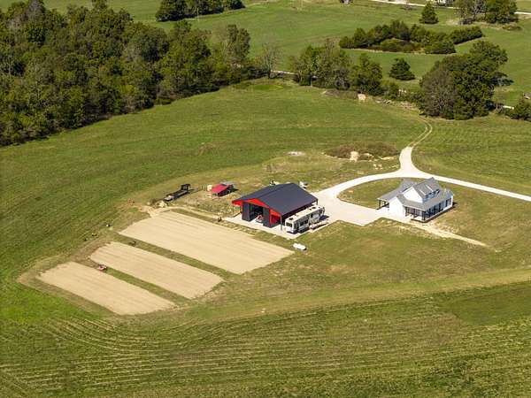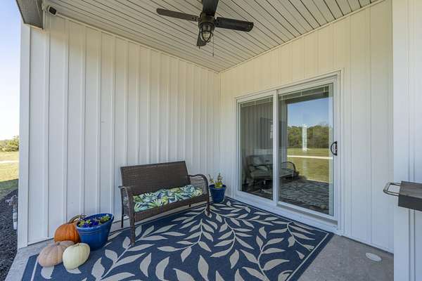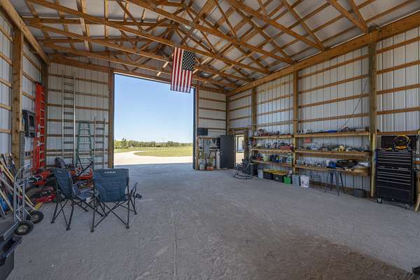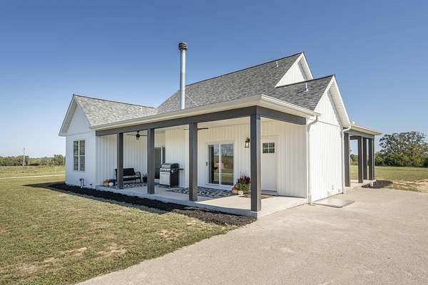 Welcome to this stunning farmhouse-style retreat, built in 2023 & perfectly nestled on 14.8 acres of open land just minutes from town. Tucked behind a gated private drive, this fully fenced property offers peaceful country living with modern comfort & convenience.From the moment you arrive, you'll be charmed by the wraparound front porch & covered back patio--ideal spots to relax & take in the views, sunsets, & serene surroundings. A small wet weather pond adds to the natural beauty and tranquility of the land.Step inside to an inviting open floor plan w/soaring vaulted ceilings, spray foam insulation, & an abundance of natural light pouring in through large windows & glass doors. The heart of the home is the kitchen, featuring custom cabinetry, sleek granite countertops, farmhouse sink, stainless steel appliances including a gas cooktop/oven, & large stained center island perfect for gathering with family & friends.The cozy living room is anchored by a wood-burning fireplace, adding warmth & character to the space. The primary suite is complete w/gorgeous en suite bathroom showcasing a stained dual-sink vanity topped with quartz, a spacious walk-in shower with dual shower heads, a private water closet, linen closet, & large walk-in closet. The second bedroom is comfortably served by a well-appointed hall bath.Additional highlights include large laundry room w/extra shelving & broom closet, water softener system, & thoughtful touches throughout that combine style & function.Outdoors, the property is fully equipped for your country lifestyle with a 30' x 48' shop featuring 16' sidewalls & doors, plus 2 lean-tos that expand the total covered space to 50' x 48' under roof. The shop is perfect for storing equipment & working on projects. You'll also find a chicken coop, RV hookup w/parking pad, & new private well. This is country living at its finest, secure, spacious, and full of charm, where you can enjoy quiet evenings, beautiful sunsets.