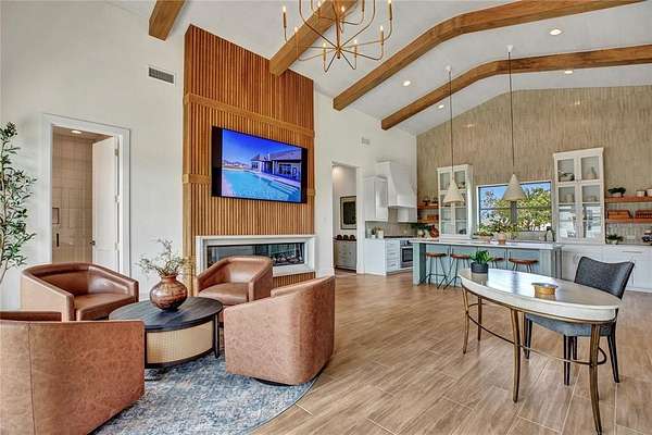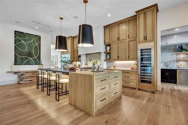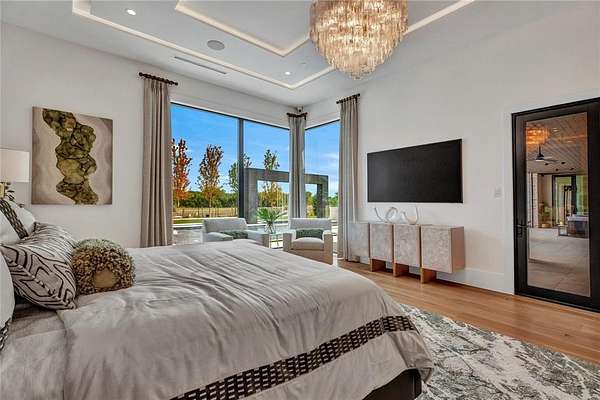 The open-concept kitchen is designed for both form and function, with premium appliances, an additional prep kitchen, and an extended walk-in pantry. Floor-to-ceiling windows in the main living area provide stunning views of the resort-style pool and outdoor entertaining space. The formal dining room features white oak flooring and a striking backlit wine wall, while a soaring 20-foot foyer with black-trimmed glass doors makes a bold first impression.
